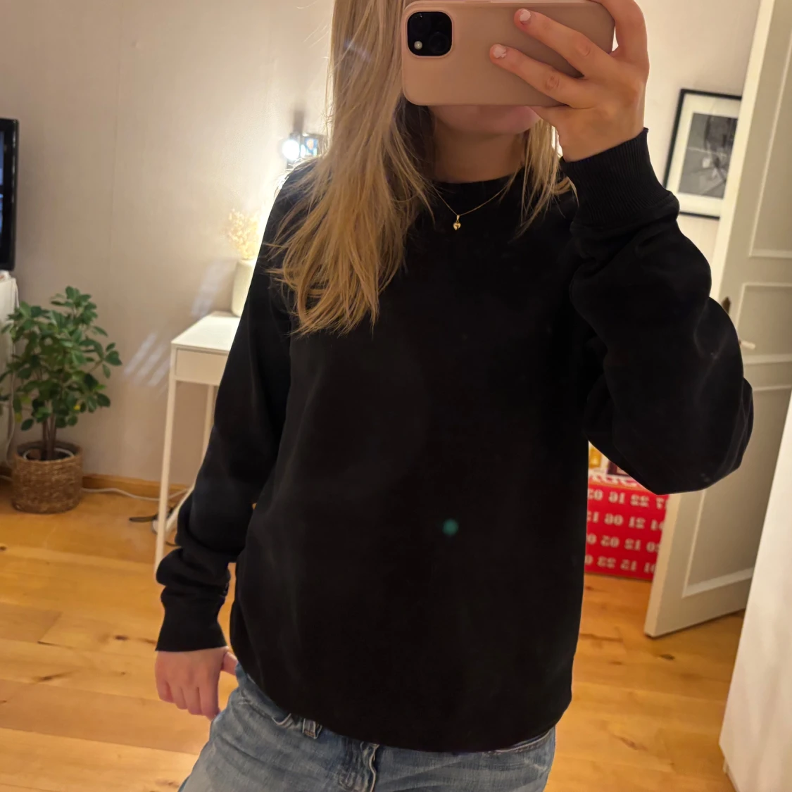 Säljer en svart tröja i bra skick. Den är perfekt för både vardag och mysiga hemmakvällar. Tröjan har långa ärmar och en normal passform. Passar till det mesta och är ett måste i garderoben!