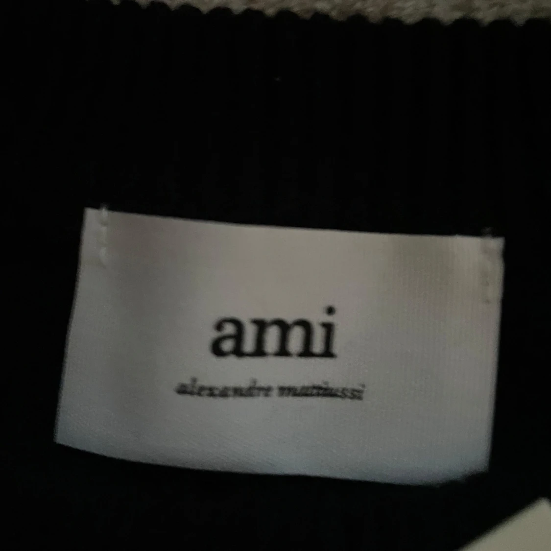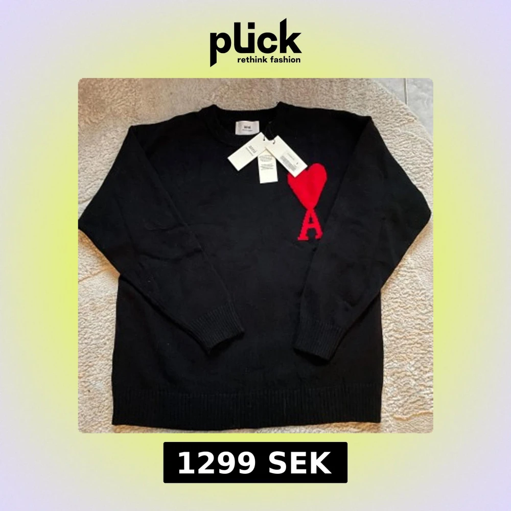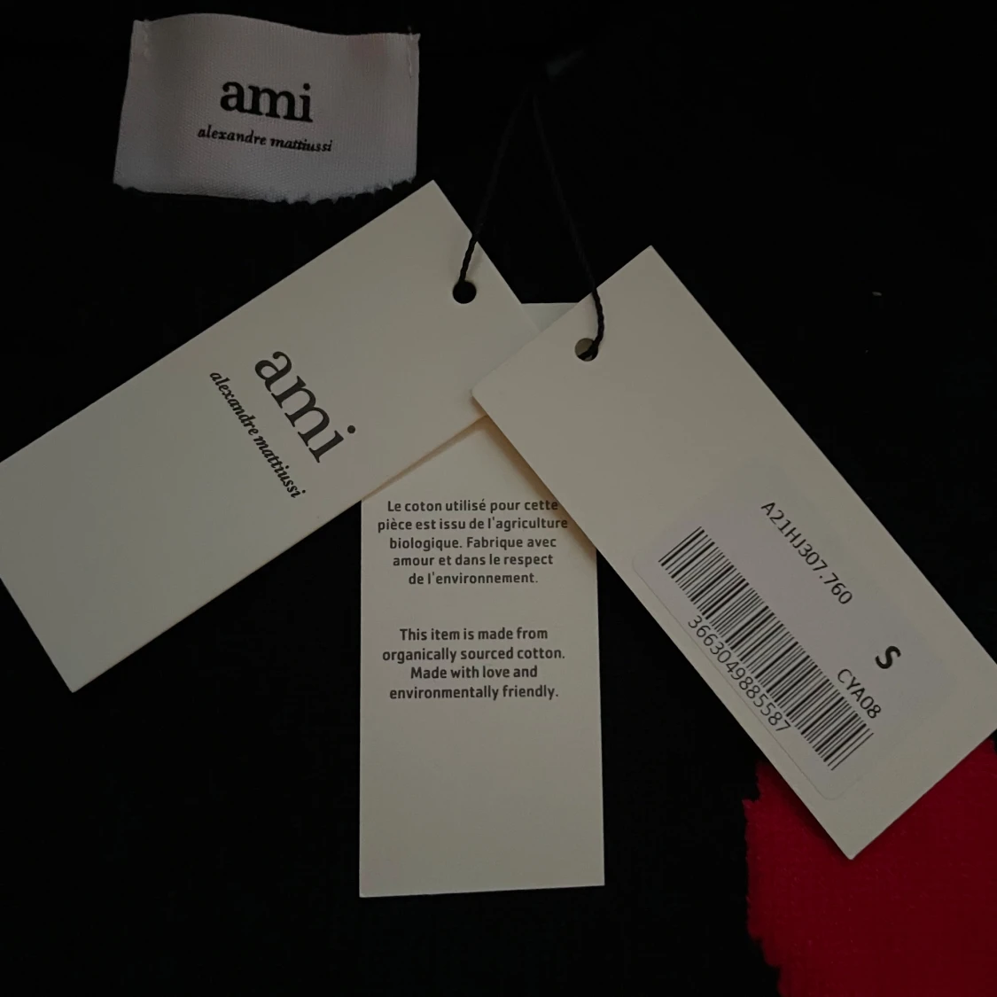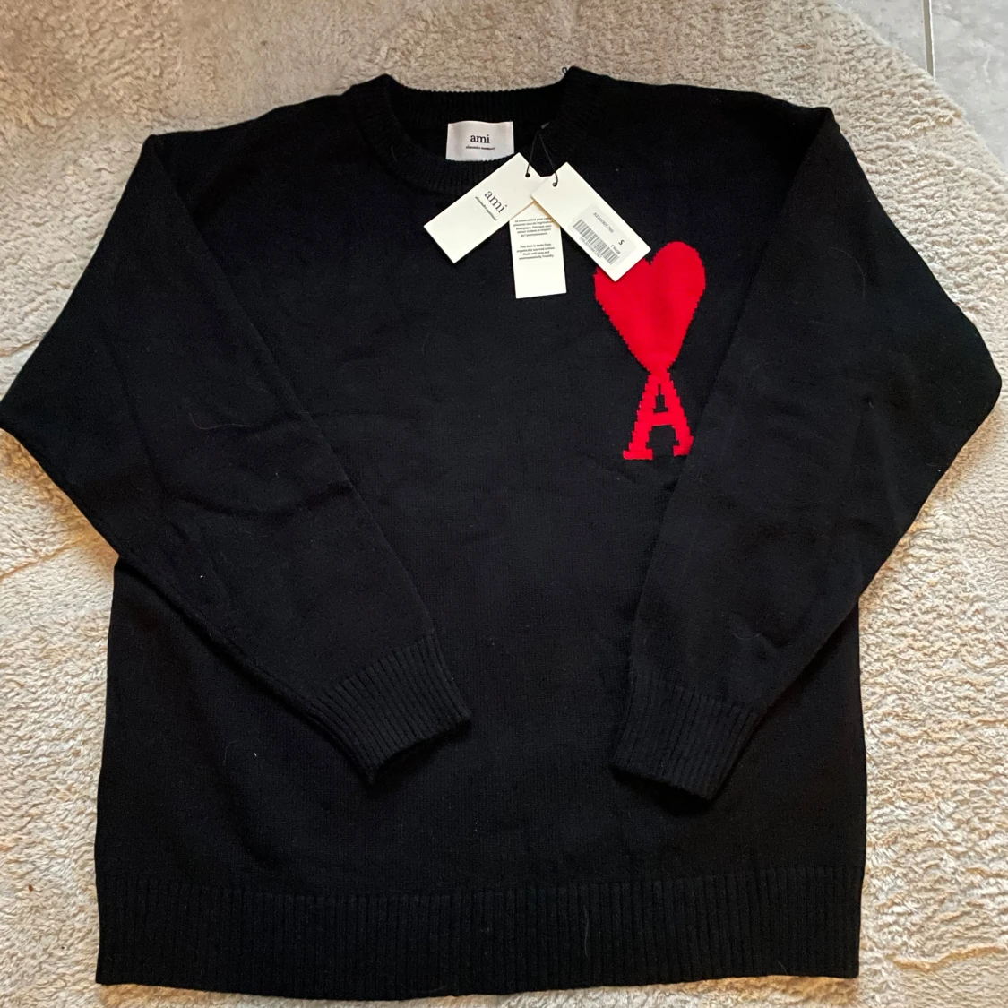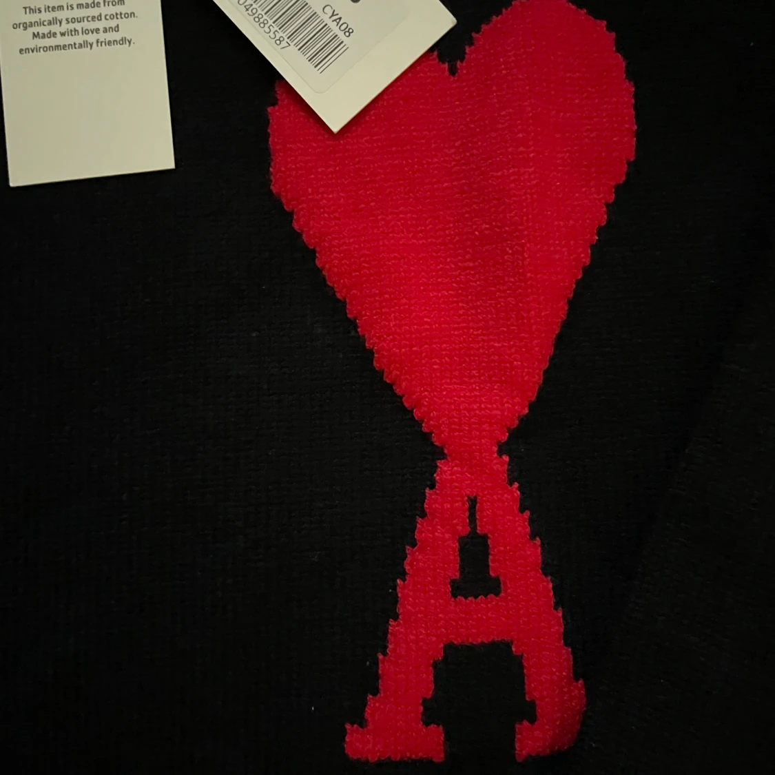 Säljer en stilren svart tröja från Ami Alexandre Mattiussi med ett rött hjärta och bokstaven A på bröstet. Tröjan är tillverkad av ekologisk bomull och har långa ärmar med ribbade muddar. Perfekt för en trendig look.