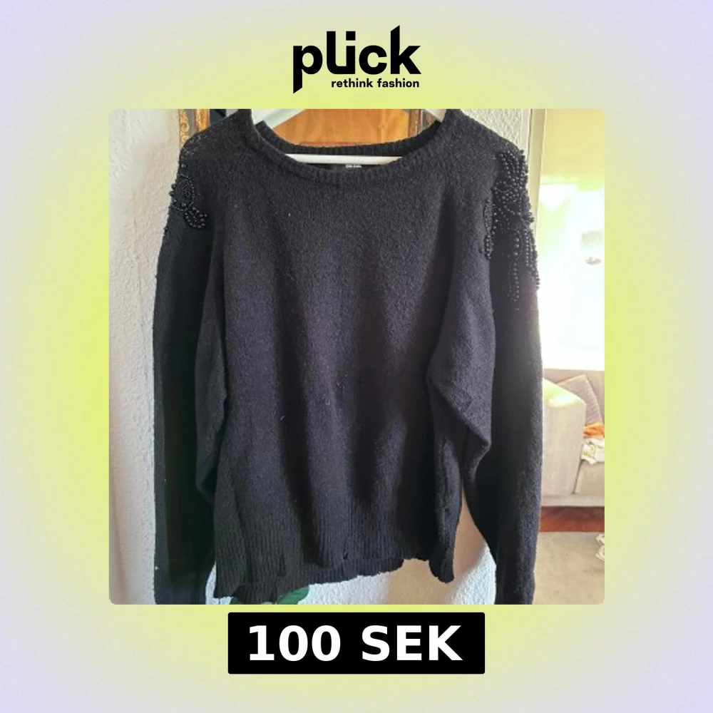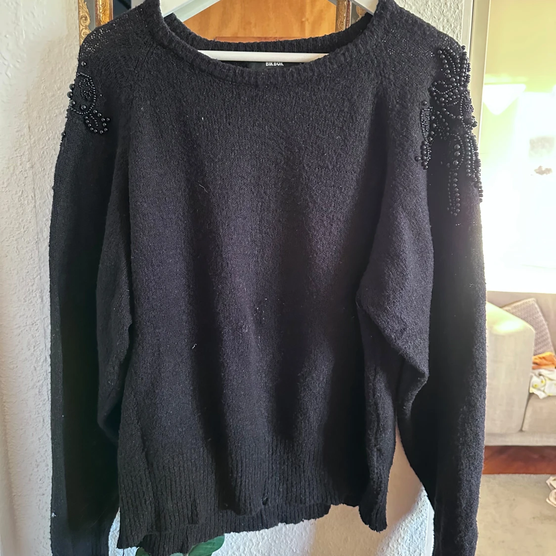 Säljer en svart tröja från BikBok med dekorativa pärlor på axlarna. Tröjan har en rund halsringning och långa ärmar. Fint skick men kommer tyvärr inte längre till användning!