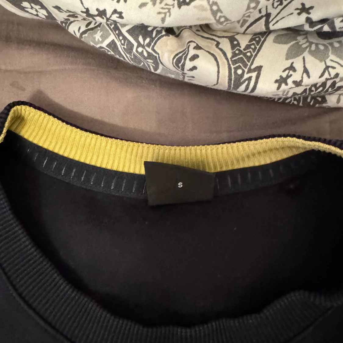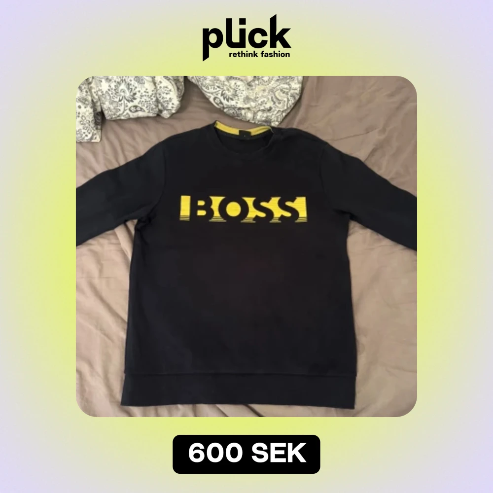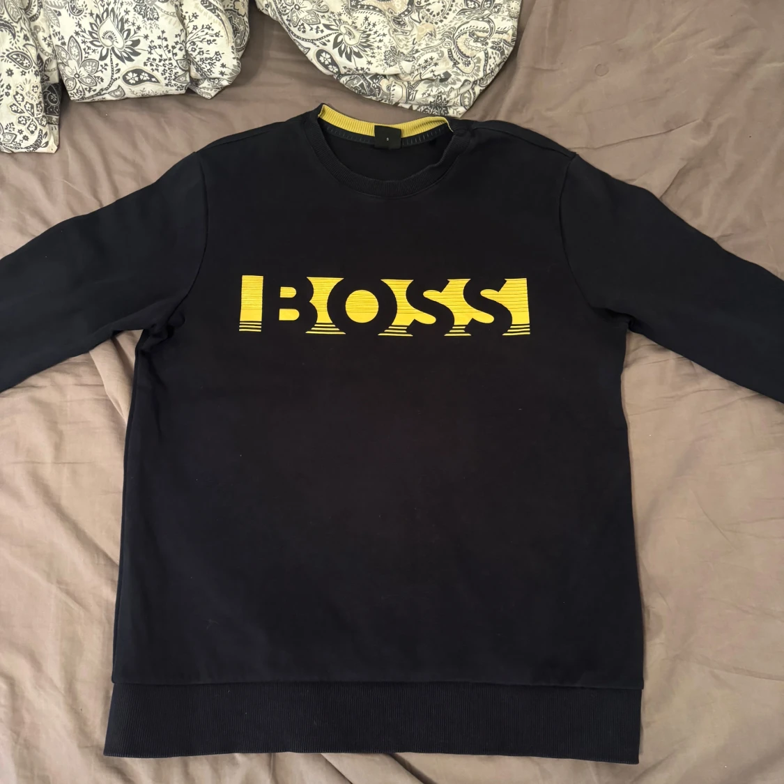 Säljer en snygg svart tröja från Boss med ett gult tryck på framsidan. Tröjan har långa ärmar och en bekväm passform. Perfekt för både vardag och fest!