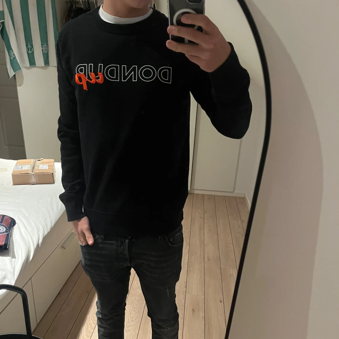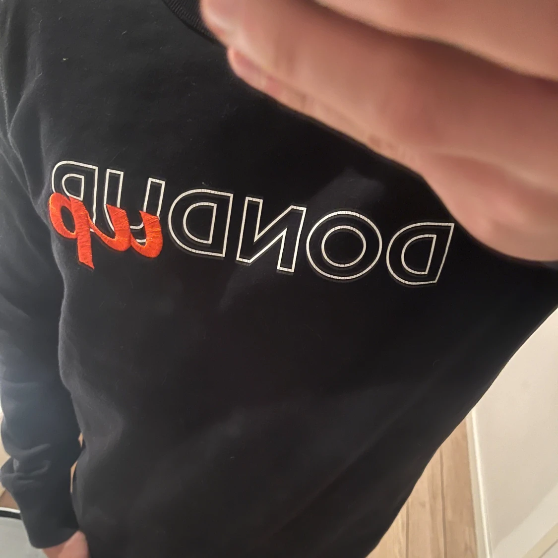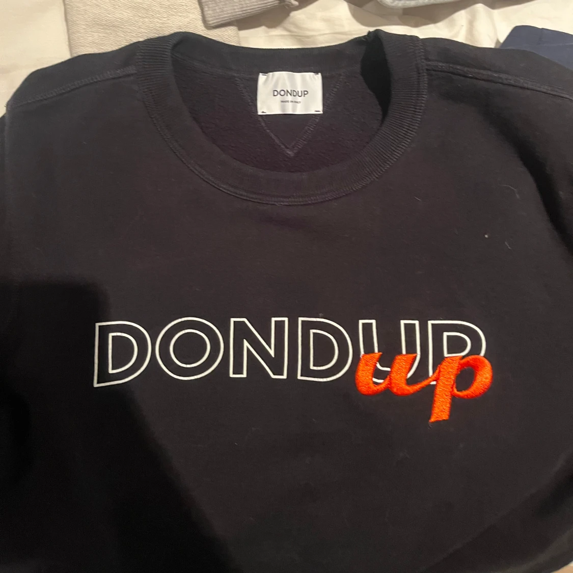 Snygg svart tröja från Dondup med vit och orange text på bröstet. Den är i extremt bra skick passar M men är man S eller till och med L kan man ha den