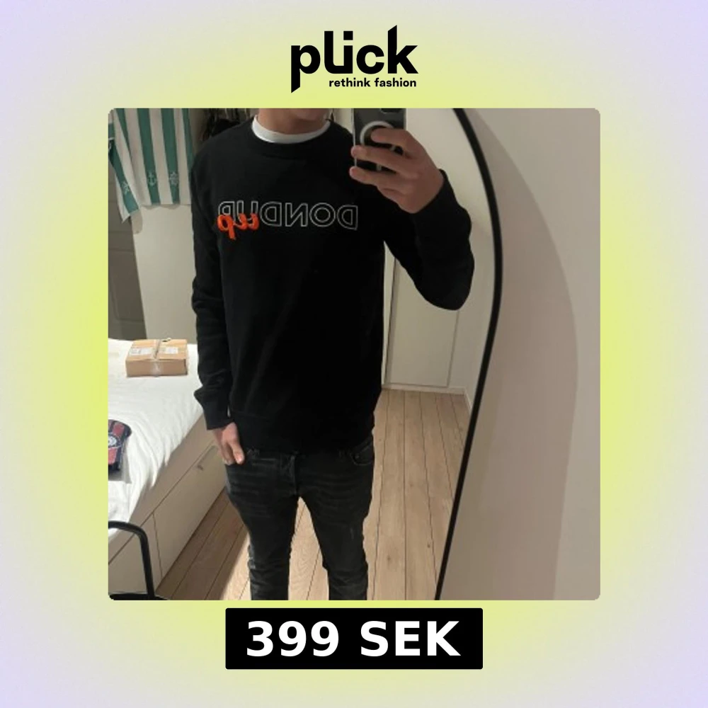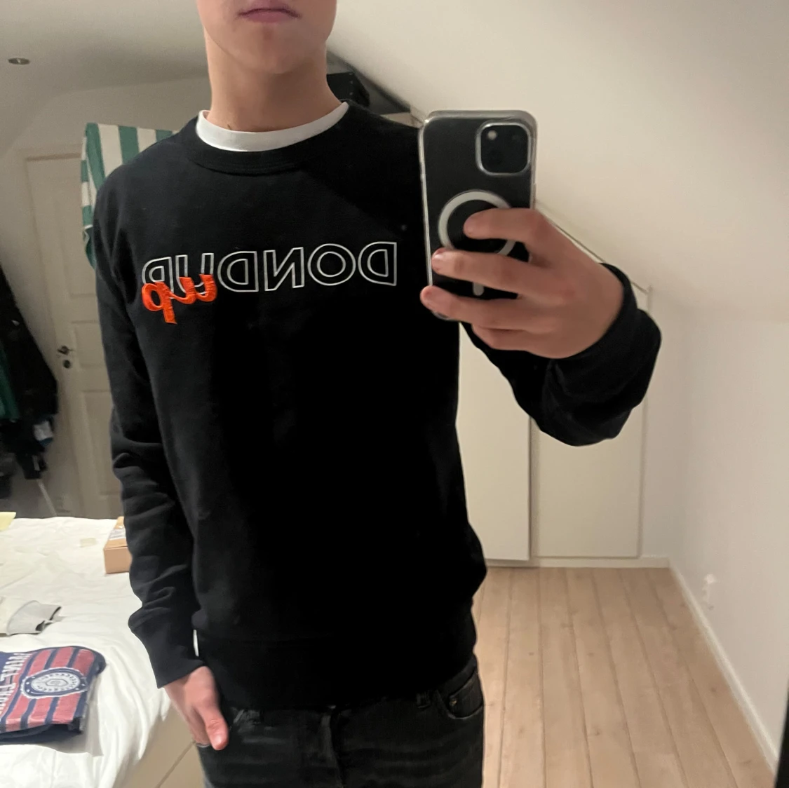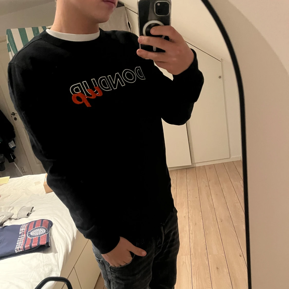 Snygg svart tröja från Dondup med vit och orange text på bröstet. Den är i extremt bra skick passar M men är man S eller till och med L kan man ha den