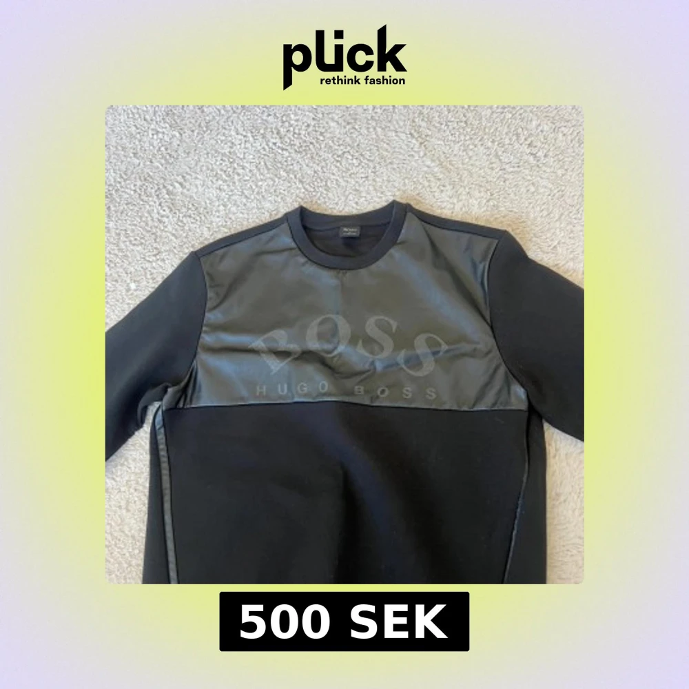Snygg svart tröja från Hugo Boss med en cool läderliknande panel över bröstet där loggan är diskret tryckt. Tröjan har långa ärmar och en rund halsringning. Perfekt för en stilren look.
