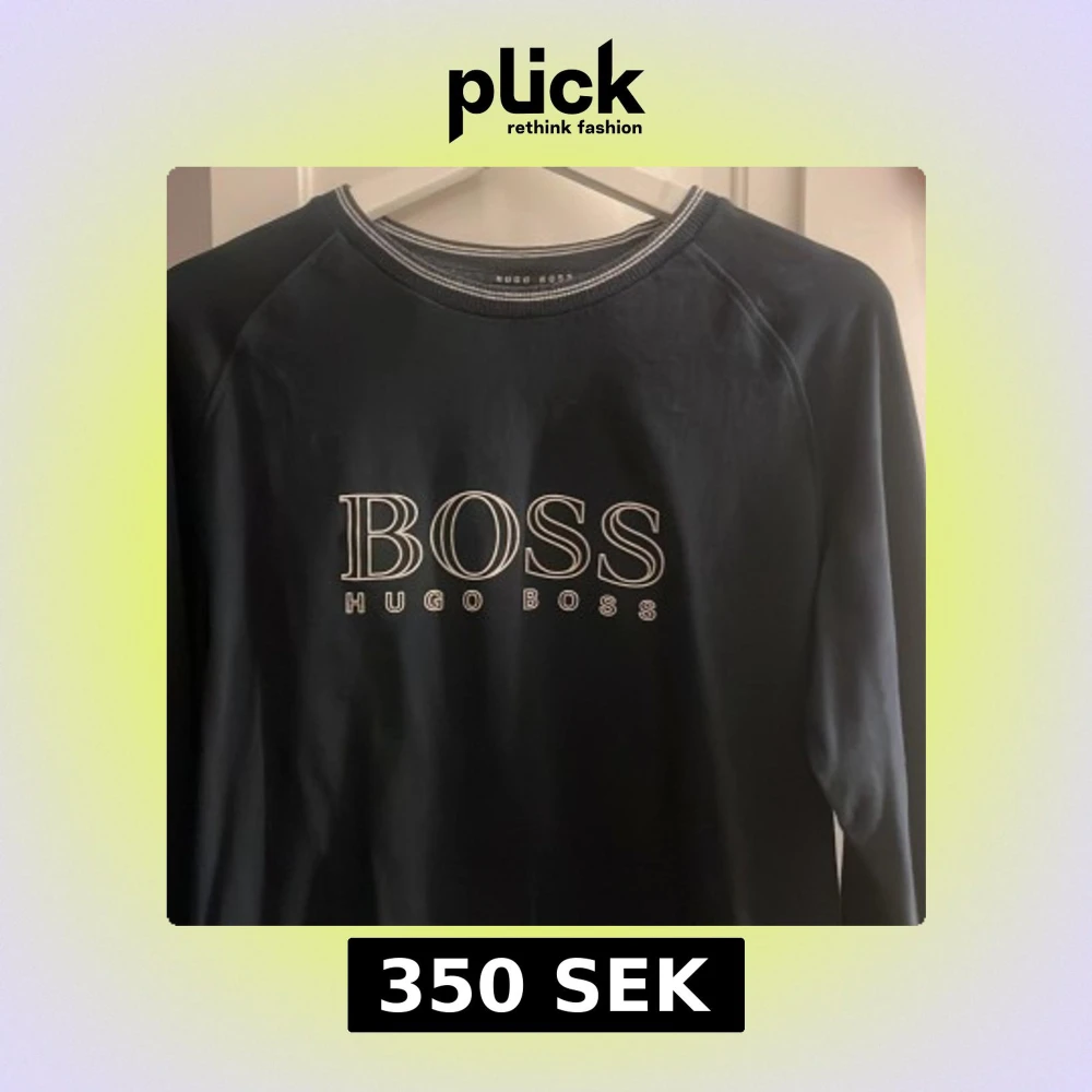 Snygg svart tröja från Hugo Boss med stort BOSS-tryck på framsidan. Tröjan har långa ärmar och en rund halsringning med diskreta ränder. Perfekt för en stilren look.
