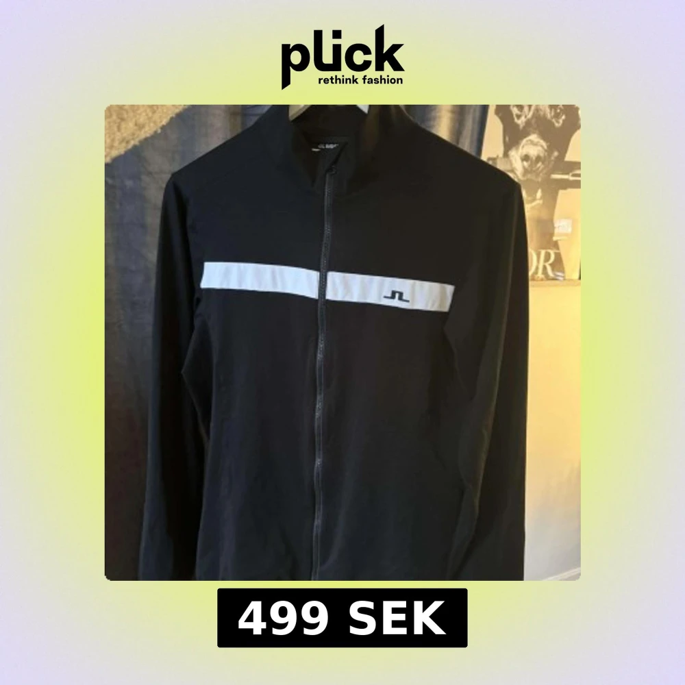 Säljer en stilren svart tröja från J.Lindeberg med en vit horisontell rand och logotyp på bröstet. Tröjan har dragkedja framtill och långa ärmar. Perfekt för en sportig look.