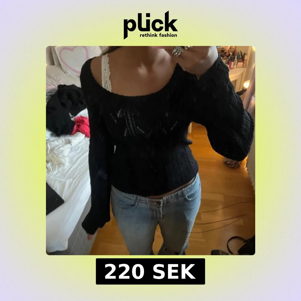 Svart tröja från Lindex i storlek S med genombrutet mönster och rundad halsringning. Tröjan har lång ärmar med vid ärm och är lite croppad i modellen💕