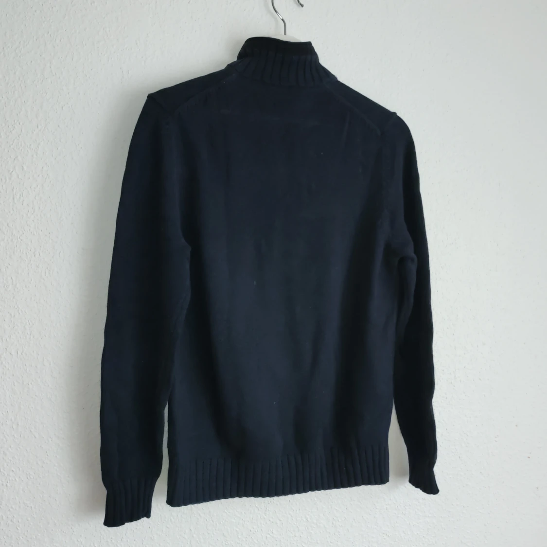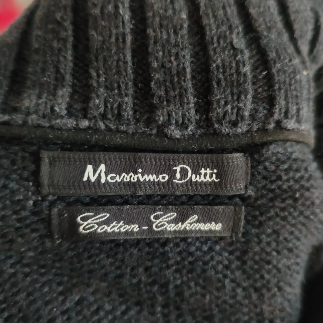 Snygg svart tröja från Massimo Dutti i en mjuk blandning av bomull och kashmir. Tröjan har en dragkedja vid halsen och ribbade detaljer vid krage, ärmslut och nederkant. Perfekt för en stilren look.