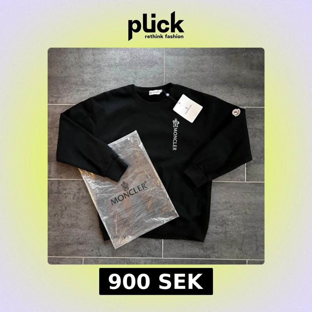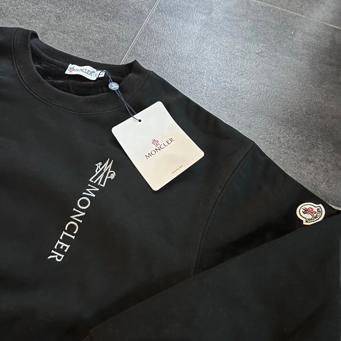 Svart sweatshirt från Moncler med vit broderad logga på bröstet och klassisk Moncler-patch på ärmen. Tröjan har rund hals, långa ärmar och ribbade muddar. Materialet är mjuk bomull och passformen är normal.