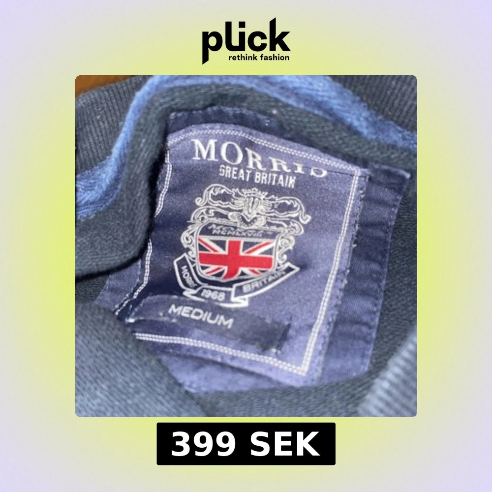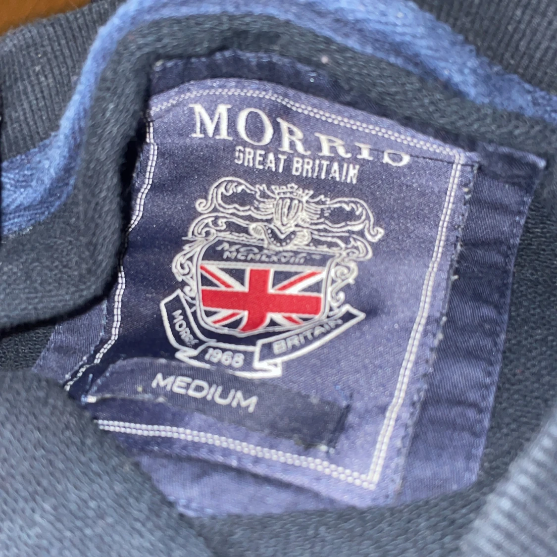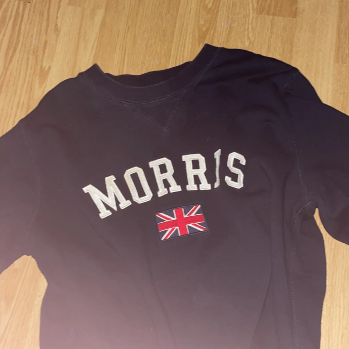 Säljer en svart tröja från Morris med ett tryck av Union Jack och texten 'Morris' på framsidan. Tröjan har en klassisk rund hals och är perfekt för en stilren look.