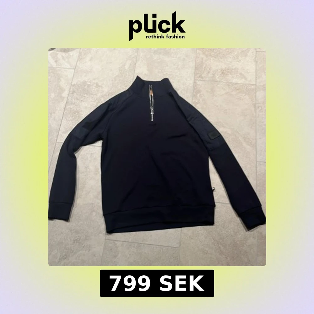 Snygg svart tröja från Mos Mosh med dragkedja vid halsen och en stilren patch på ärmen. Perfekt för en avslappnad men ändå stilren look. KAN GÅ NER I PRIS VID SNABB AFFÄR