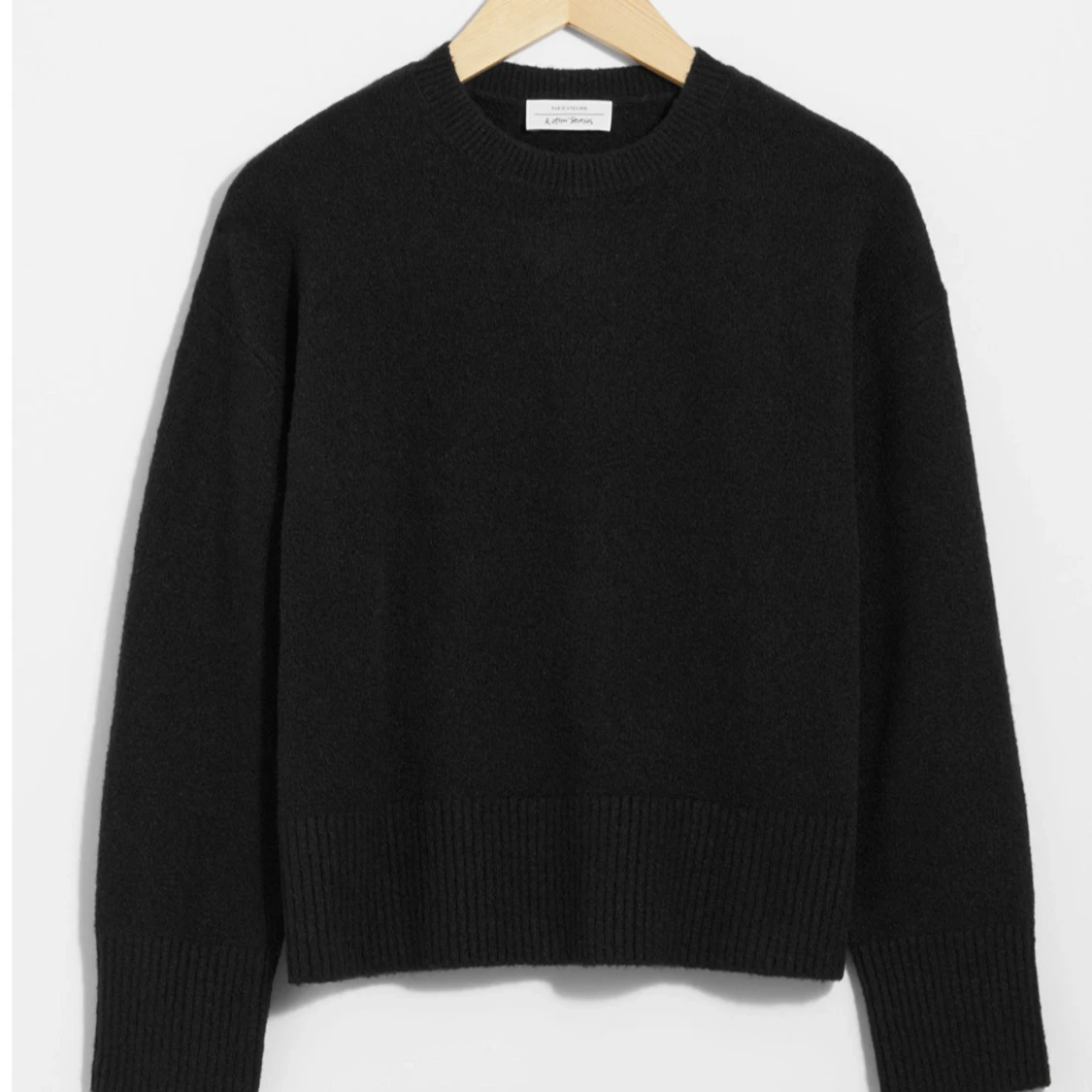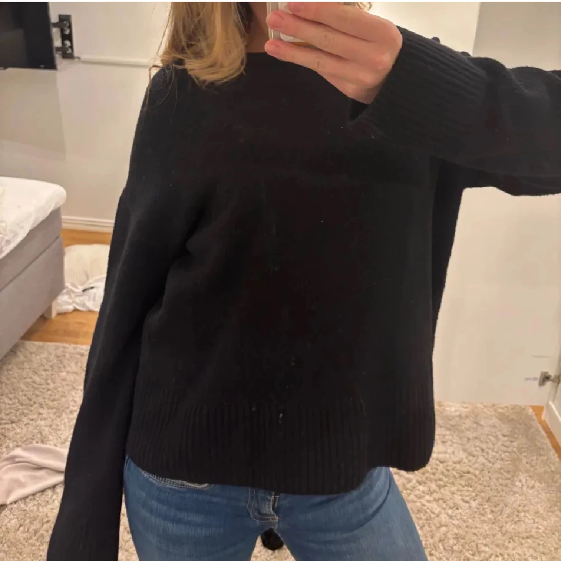 Säljer en stilren svart tröja från & Other Stories. Tröjan har en klassisk rund halsringning och långa ärmar. Den är ribbad vid ärmslut och nederkant vilket ger en snygg passform. Perfekt för en minimalistisk look.