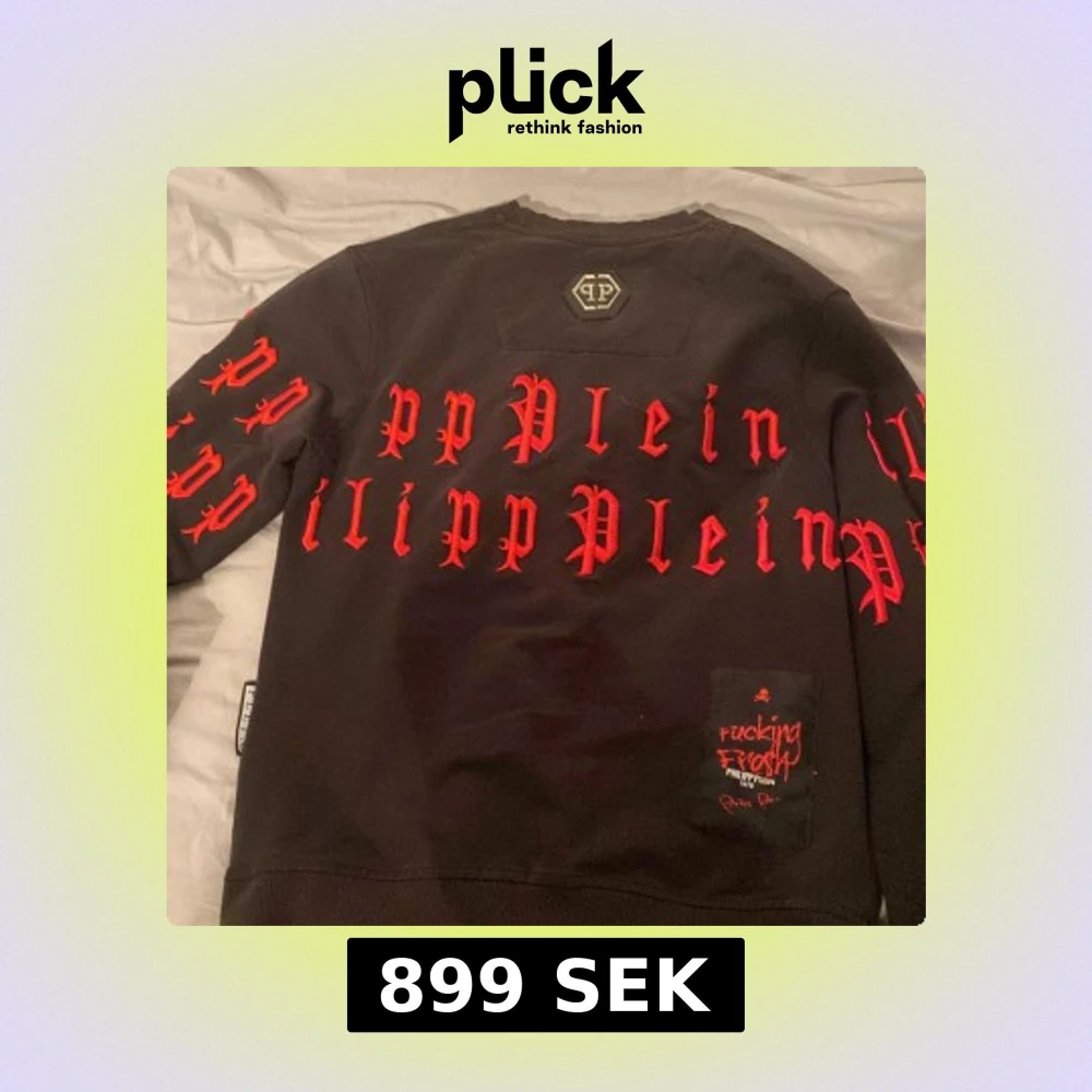 Snygg svart tröja från Philipp Plein med röd gotisk text över hela framsidan och ärmarna. Tröjan har en rund halsringning och ett märke med PP-logga på ryggen. Perfekt för en cool och edgy stil. Inte helt säker på nypris men tror de var runt 5500kr men mitt pris är 899kr. Mvh Damian