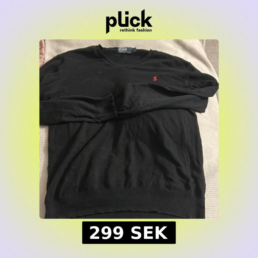 Säljer en klassisk svart tröja från Polo Ralph Lauren med v-ringning och det ikoniska röda logotypbroderiet på bröstet. Tröjan har långa ärmar och ribbade muddar vid ärmslut och nederkant. Perfekt för en stilren look.