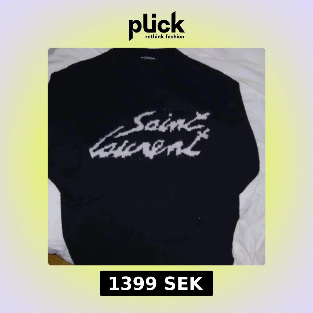 Säljer en svart tröja från Saint Laurent med vit text på framsidan. Tröjan har en klassisk design och är perfekt för en stilren look. Passar bra till både jeans och kjol. Använd endast en gång och har I get tecken på användning