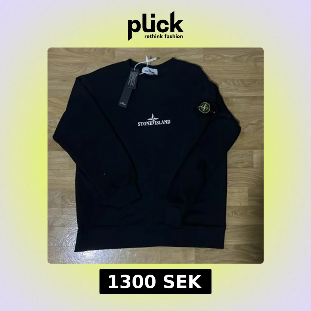 Säljer en svart tröja från Stone Island med deras ikoniska logga på bröstet och en stor logga på ryggen. Tröjan har långa ärmar och en rund halsringning. Perfekt för en stilren look.