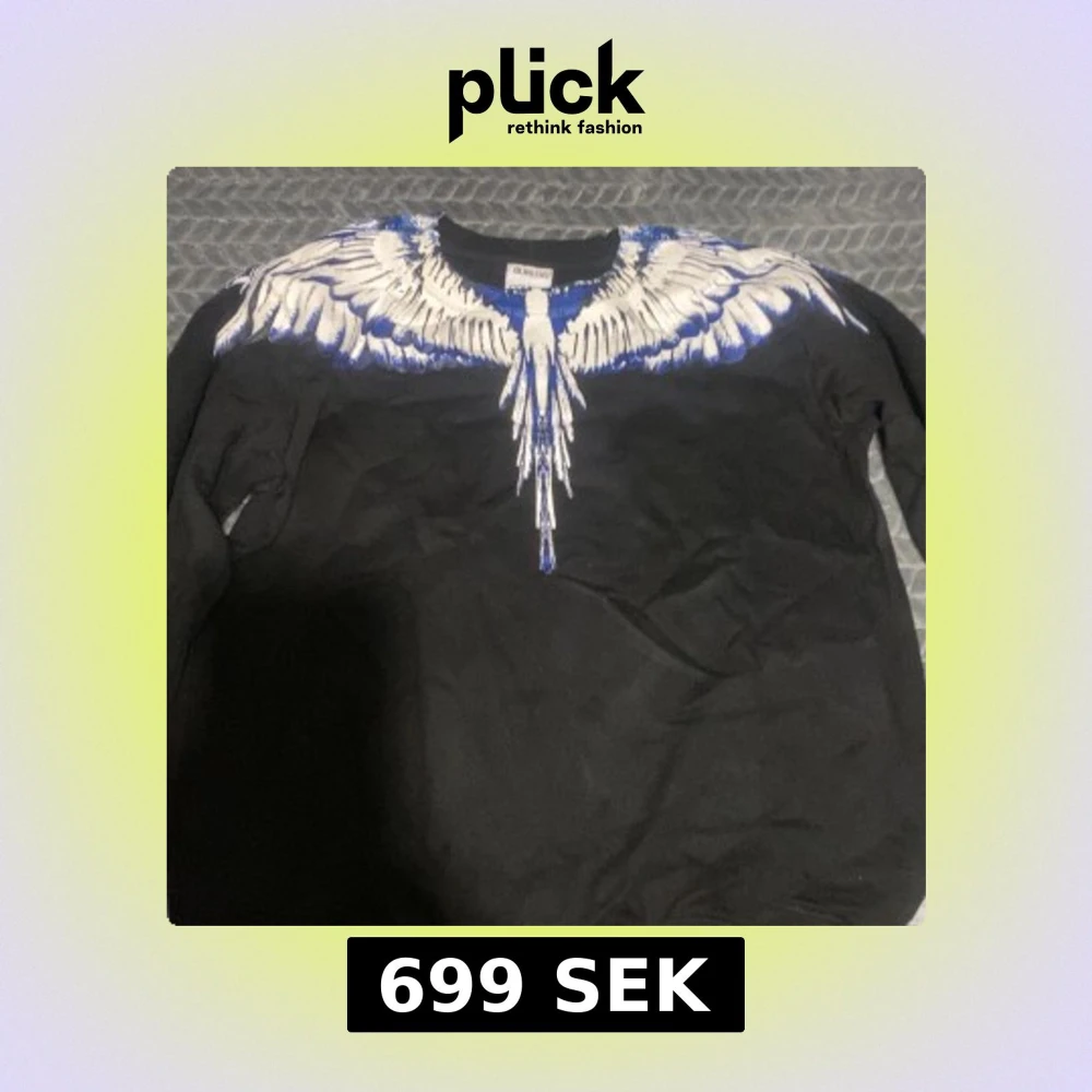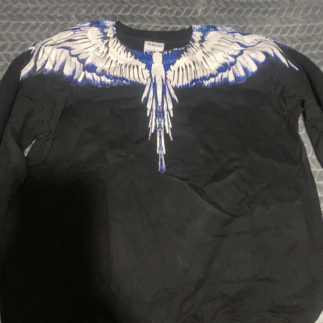 Svart långärmad tröja från Marcelo Burlon med ikoniskt vingtryck i vitt och blått över axlar och bröst. Tröjan har rund halsringning och en relaxed passform, perfekt för dig som vill sticka ut med en unik design.
