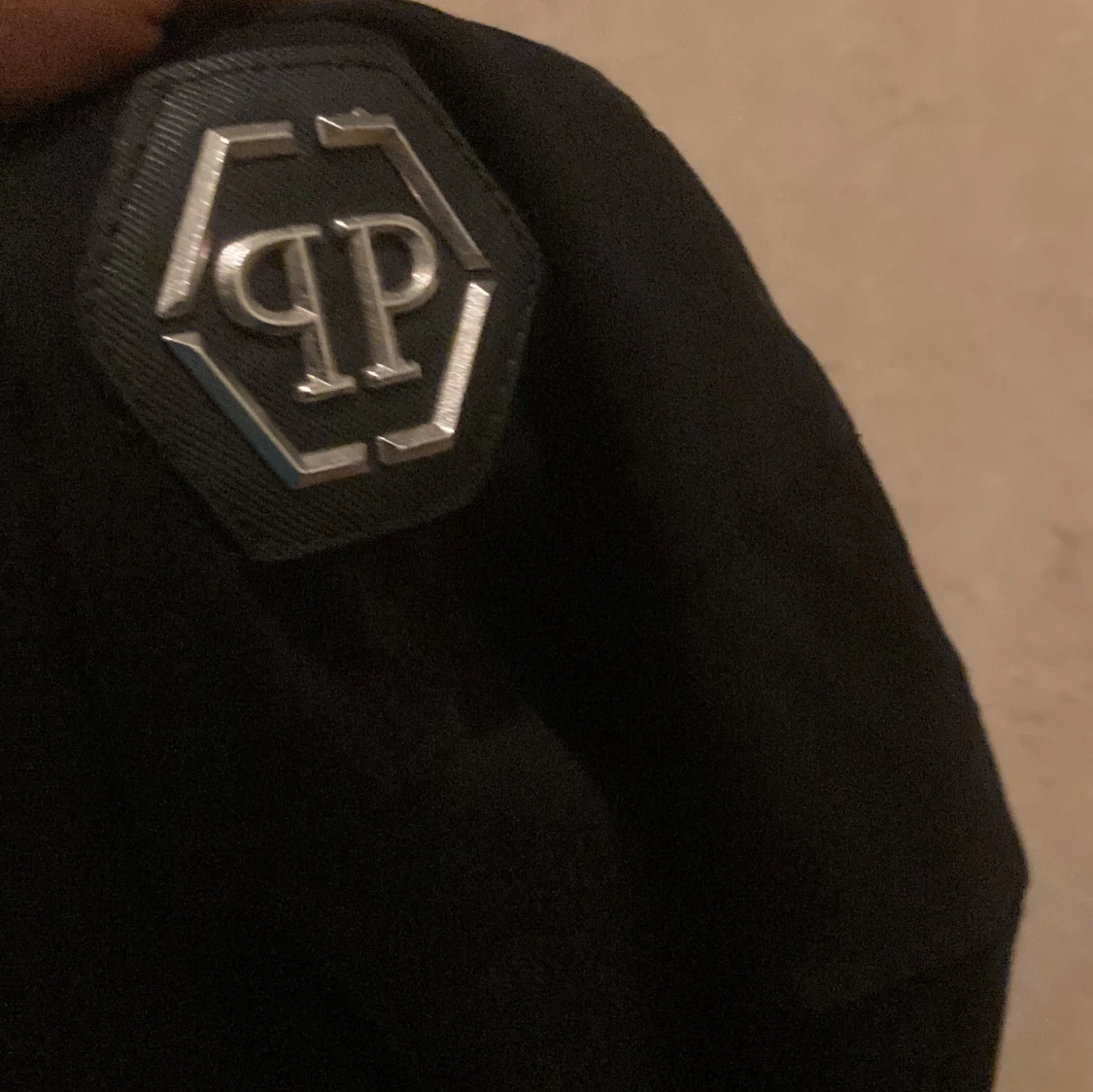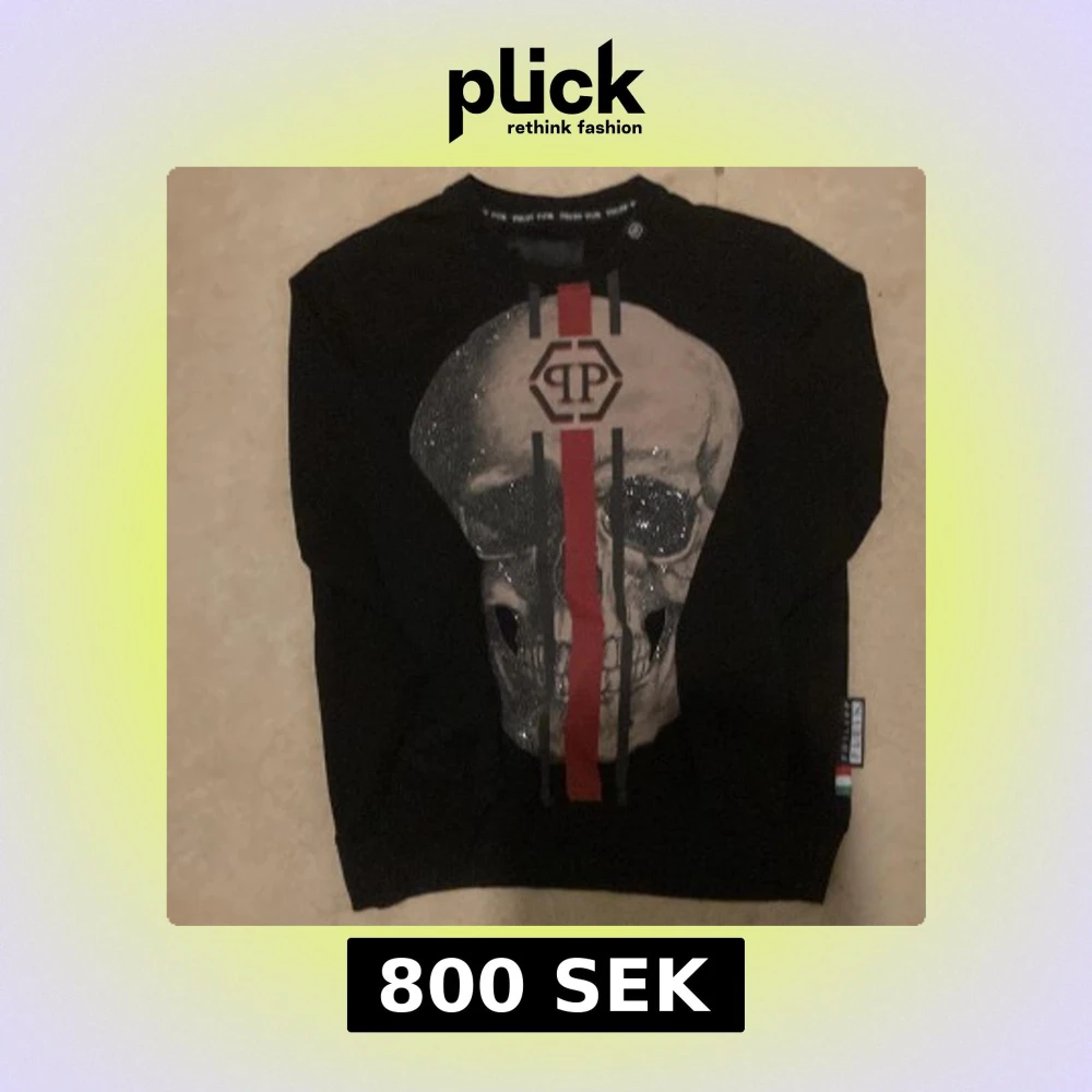 Cool svart långärmad tröja från Philipp Plein med stor dödskalle framtill, röda och svarta ränder samt glittriga detaljer. Tröjan har PP-logga på bröstet och en metallbadge på axeln. Perfekt för dig som gillar edgy streetstyle.