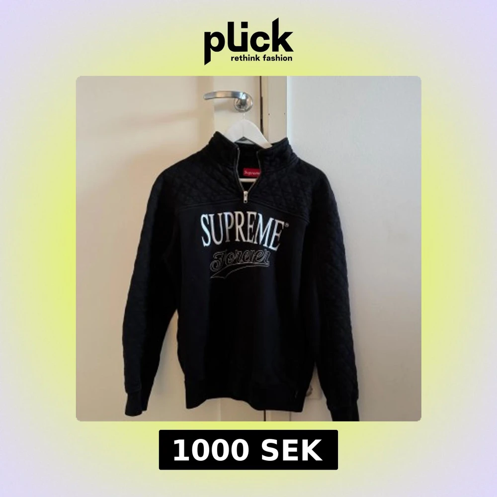 Snygg svart tröja från Supreme med texten 'Supreme Forever' på framsidan. Tröjan har en dragkedja vid halsen och quiltade detaljer på axlarna. Perfekt för en stilren look. Storlek S, normal i storlek, condition 8/10!