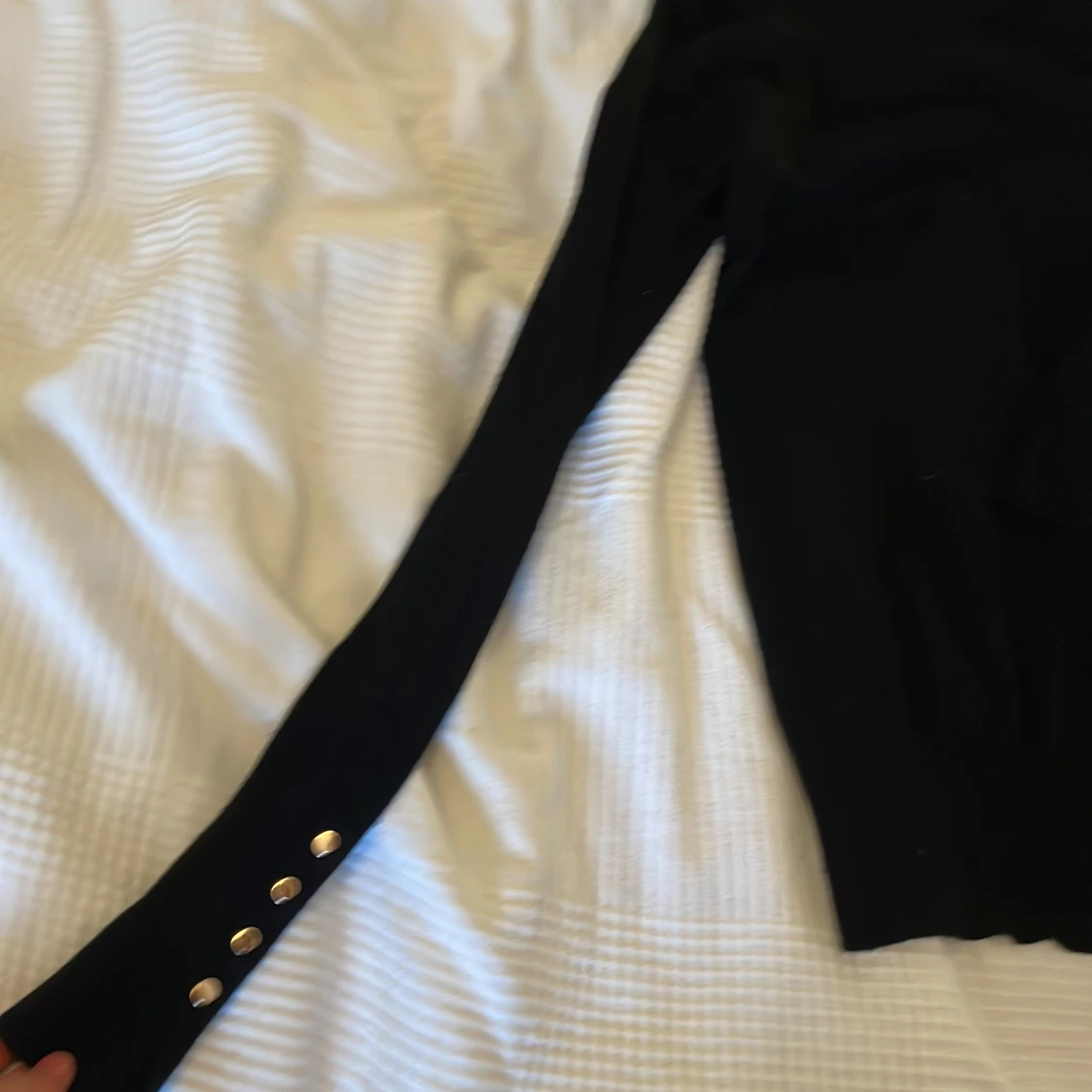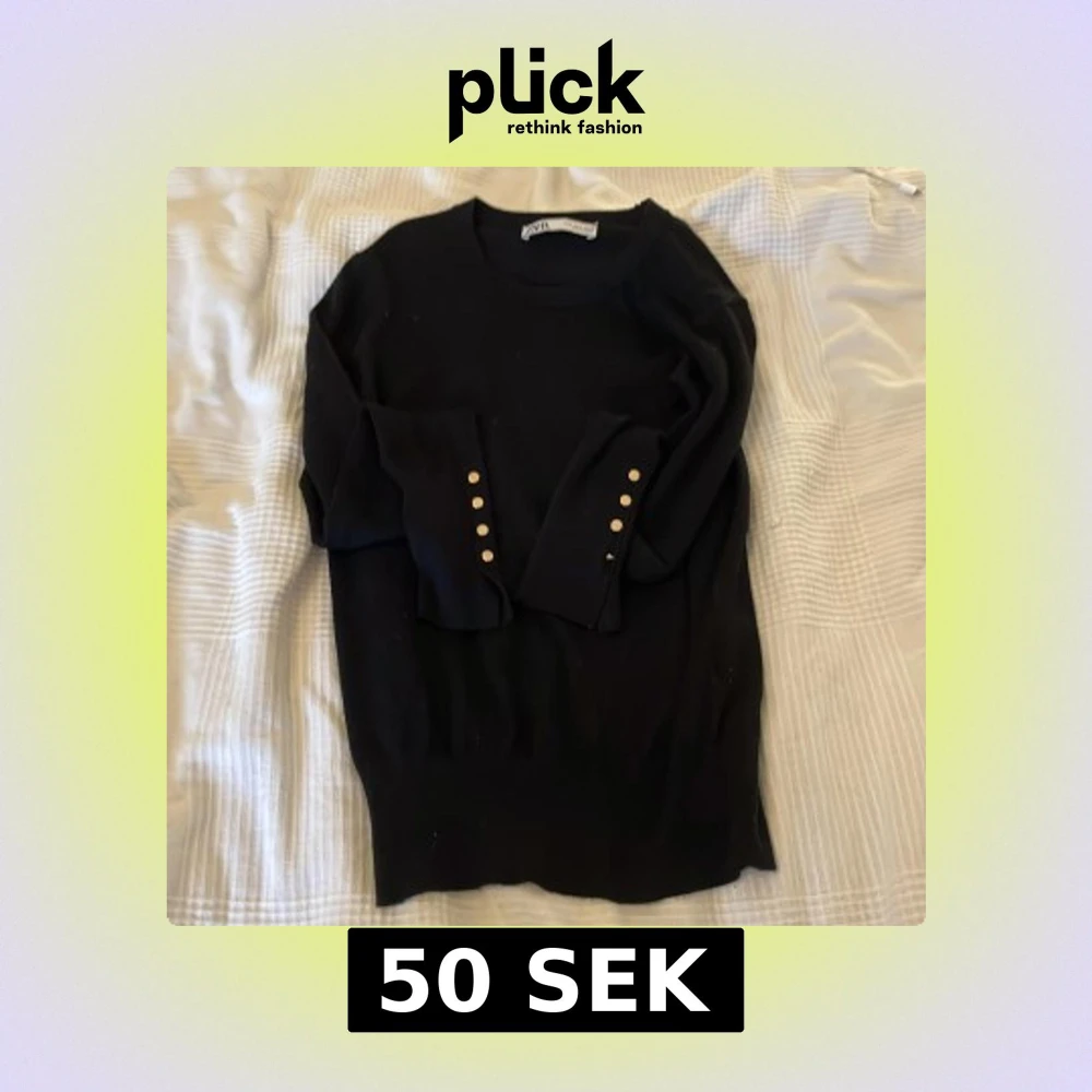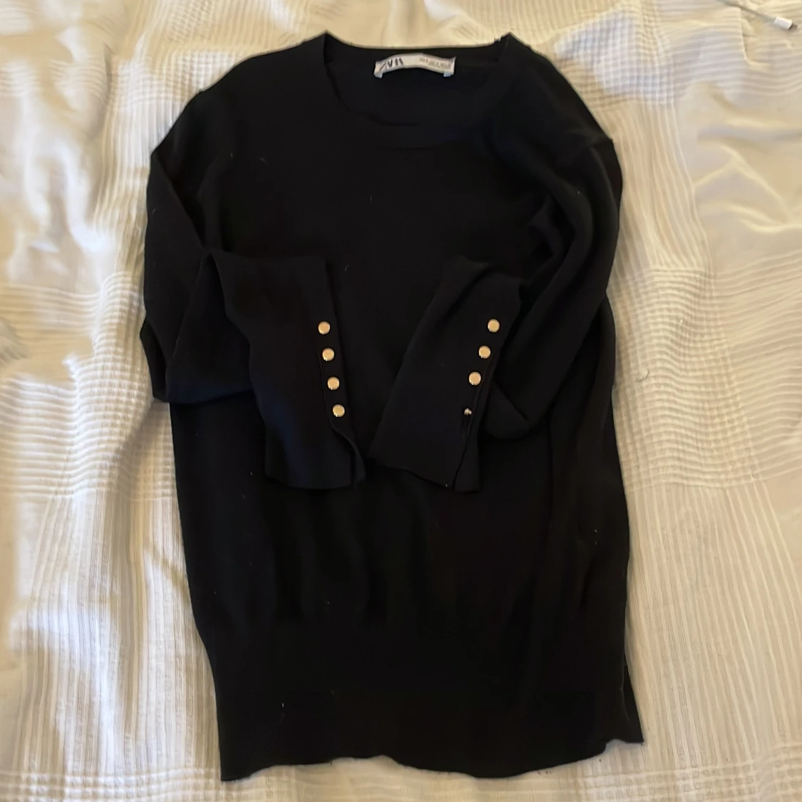 Svart långärmad tröja från Zara med snygga guldknappar på ärmsluten. Tröjan har en klassisk rund halsringning och är i mjukt material som sitter skönt på kroppen. Perfekt för dig som gillar stilrena detaljer och enkel design.