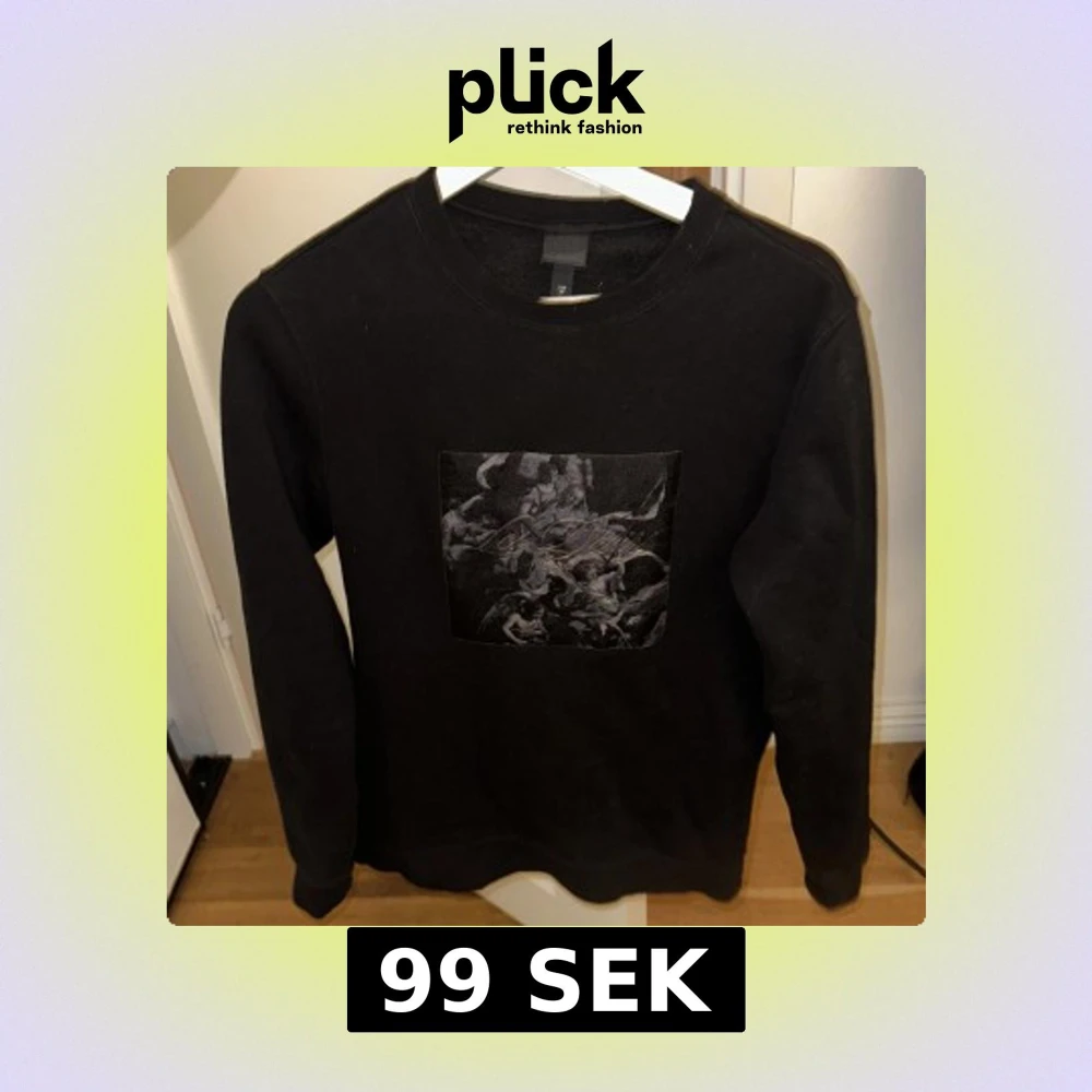 Snygg svart tröja med ett unikt konstmotiv på framsidan. Tröjan har långa ärmar och en rund halsringning, perfekt för en stilren look.