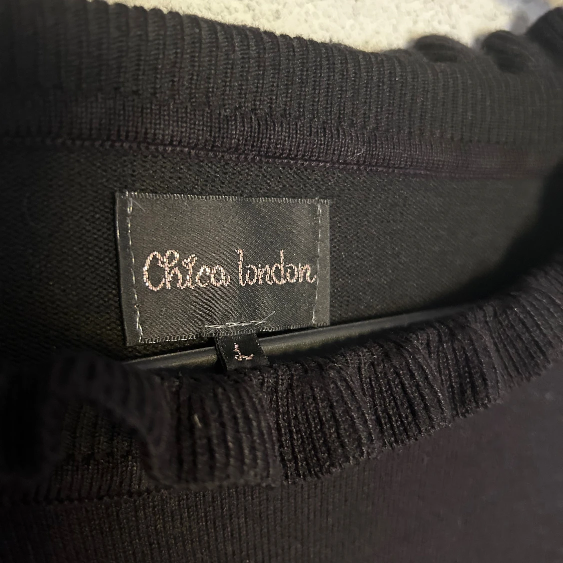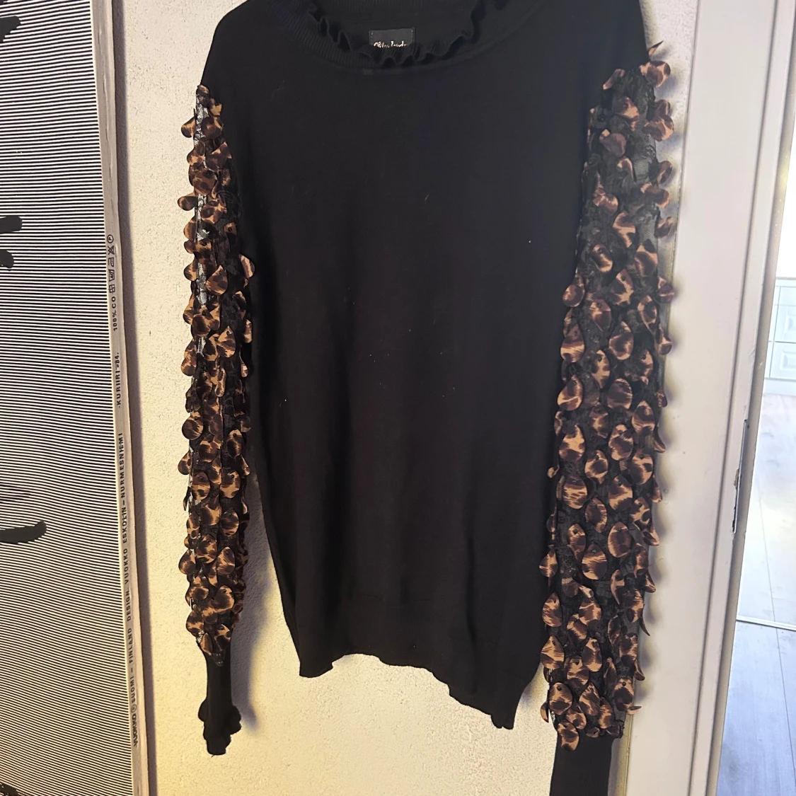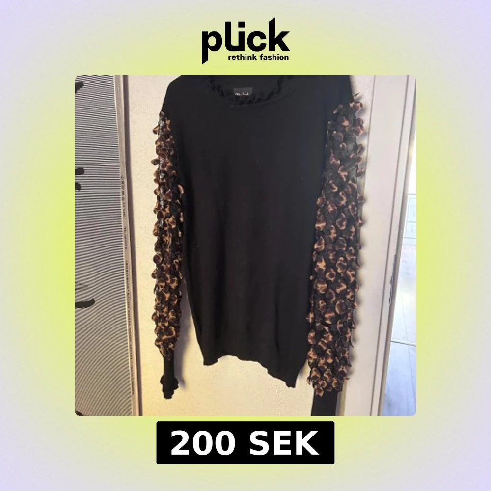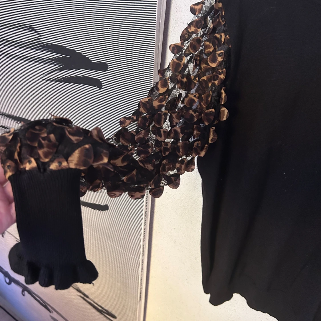Cool svart tröja från Chica London med unika långärmade leopardmönstrade detaljer. Ärmarna är transparenta och 3D-effekt med små tygbitar i leopardmönster. Perfekt för dig som vill sticka ut med en trendig och edgy look. Fin rundad hals. Material finstickad bomull och elastane. Strl Large men mer som en M