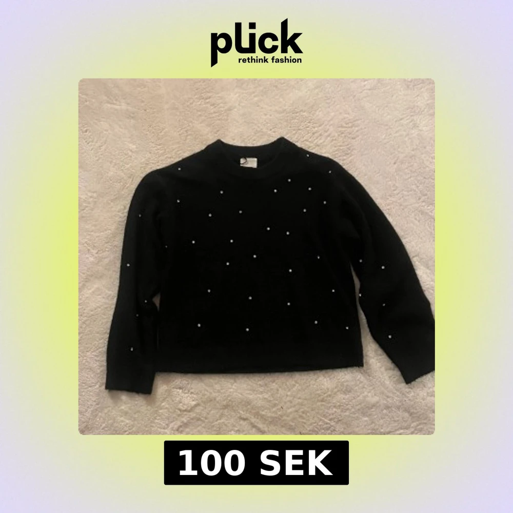 Säljer en elegant svart tröja dekorerad med små pärlor. Tröjan har långa ärmar och en klassisk passform. Perfekt för att ge en touch av stil till din garderob.
