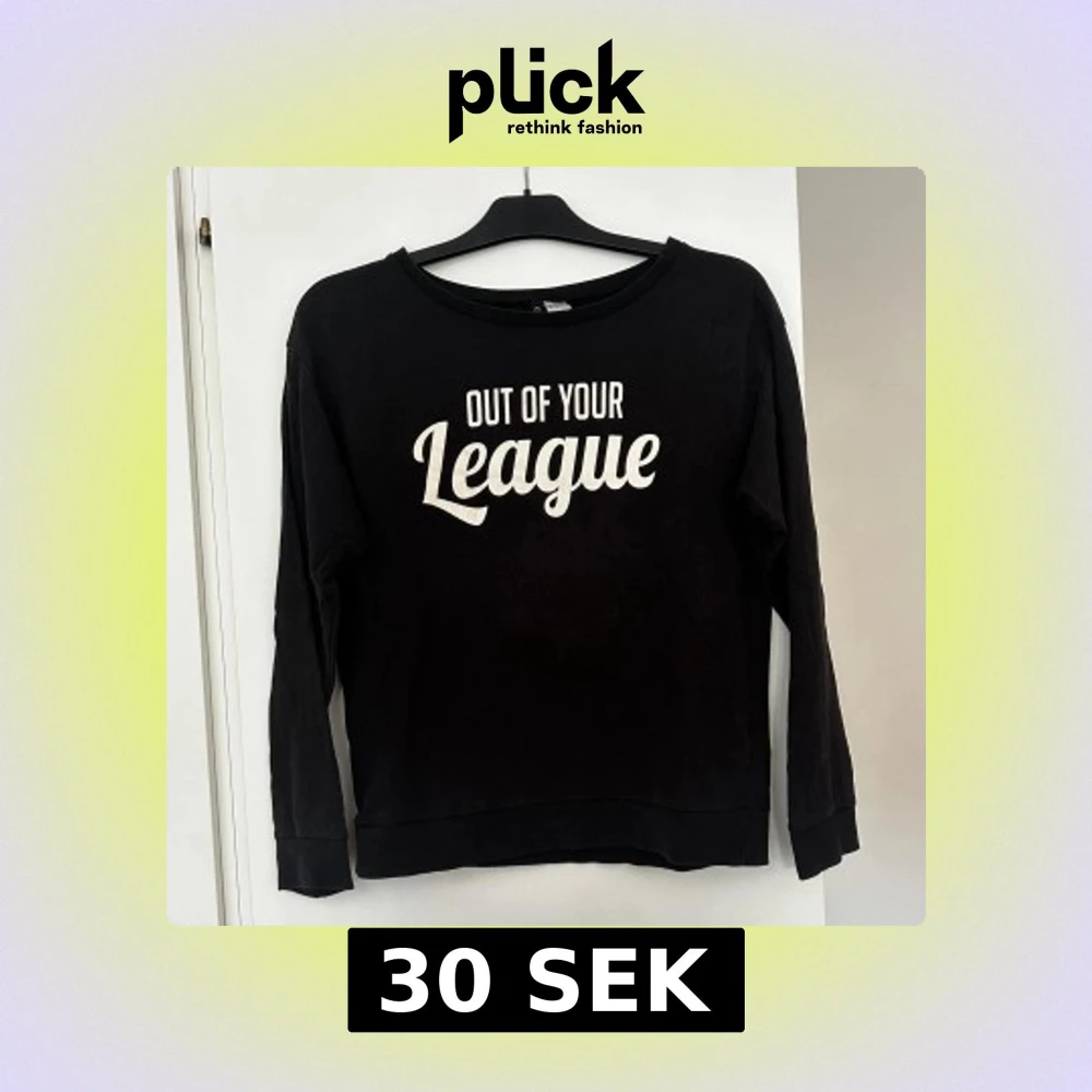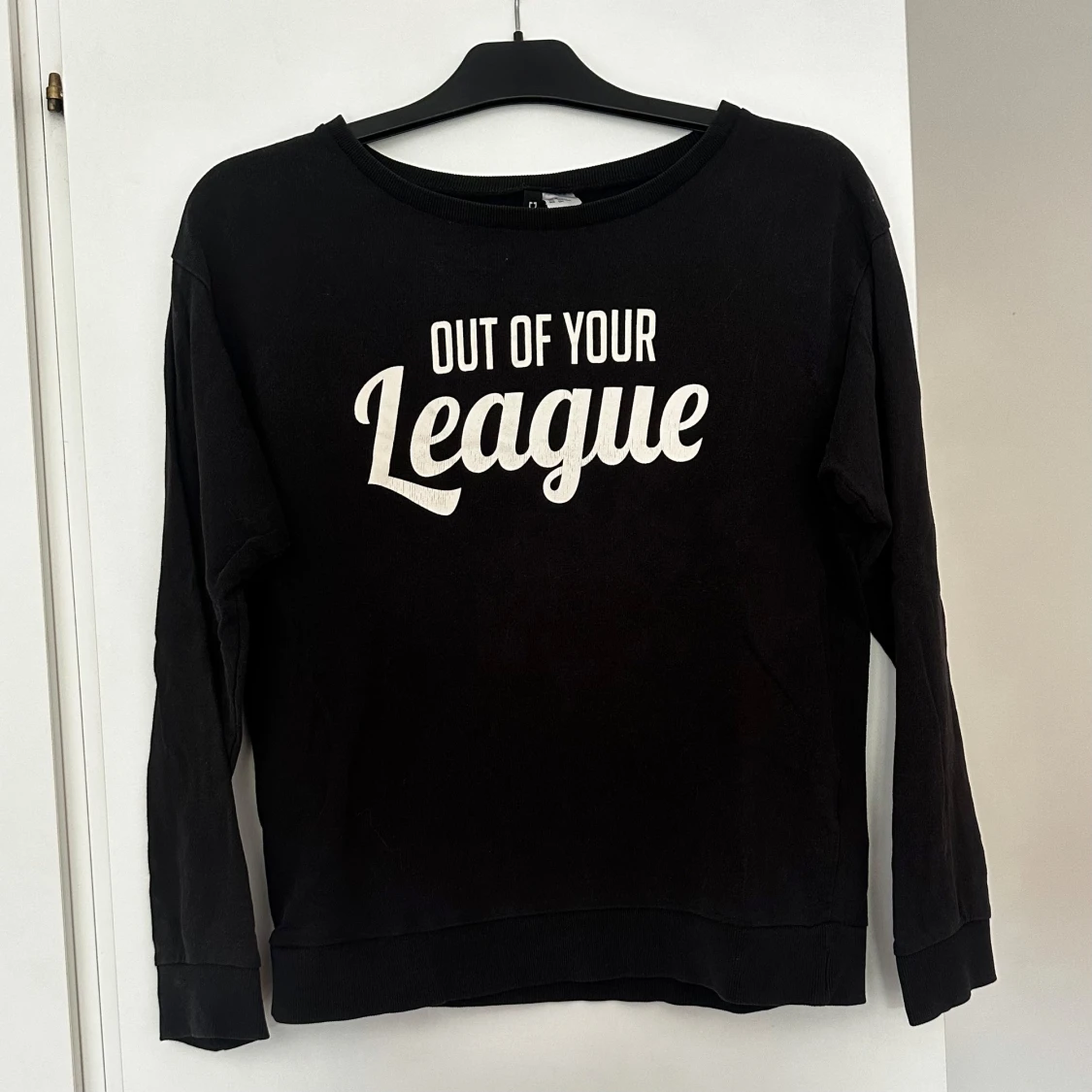 Svart långärmad tröja från H&M med vit text 'Out of your League' på bröstet. Tröjan har rund halsringning och långa ärmar. Storlek S, men passar även om man har storlek M. Aldrig använd.