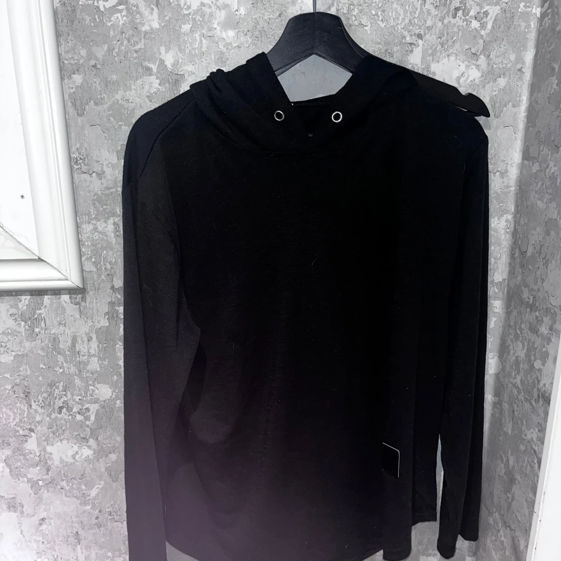 Säljer en stilren svart hoodie med långa ärmar och justerbar huva. Perfekt för en avslappnad look. Passar bra till både jeans och träningsbyxor.