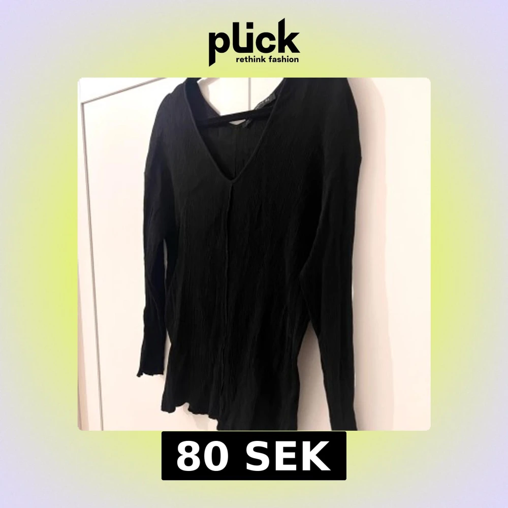Säljer en svart blus med v-ringning och lång ärm. Tyget är lätt och har en skrynklig struktur som ger en avslappnad känsla. Perfekt att styla med jeans eller kjol för en enkel men snygg look.
