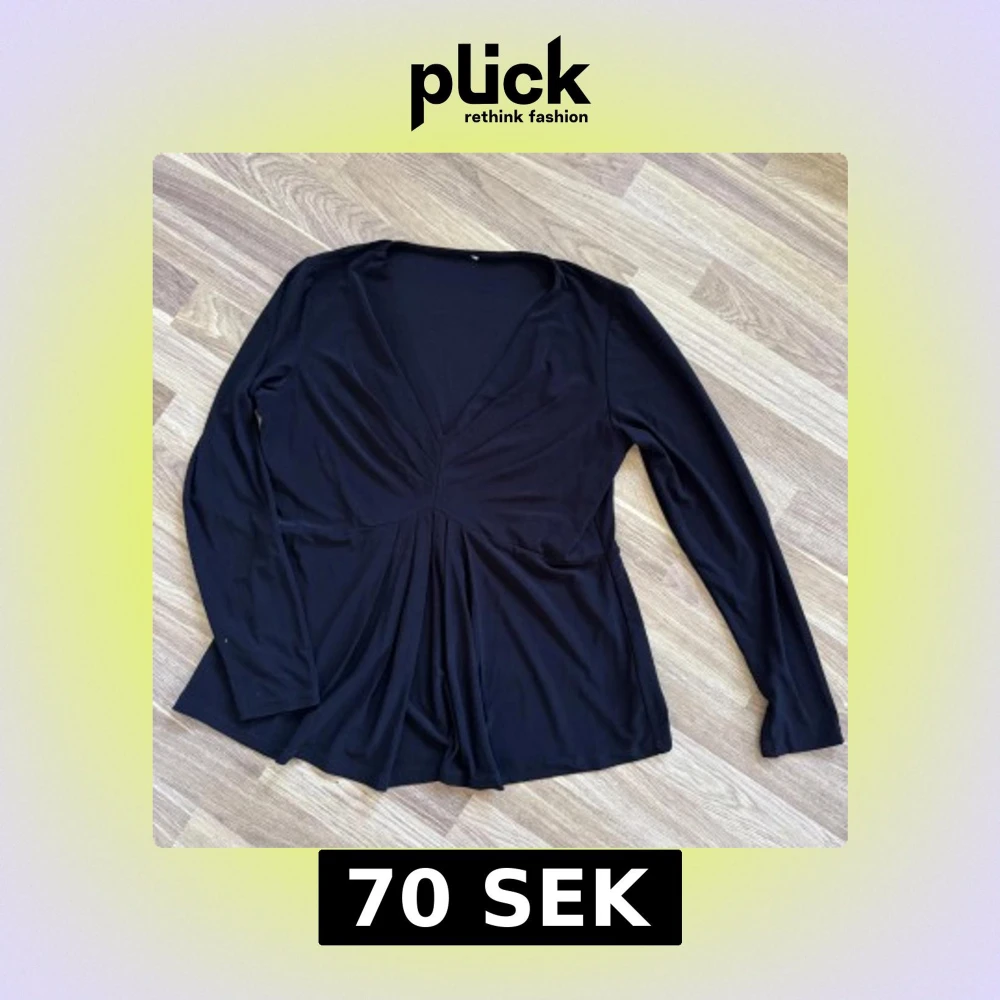 Svart långärmad topp med djup v-ringning och snygga draperingar framtill. Modellen har en lösare passform nedtill och är tillverkad i ett mjukt, stretchigt material som känns skönt mot huden. Skulle gissa att det är storlek L, lappen är borta.