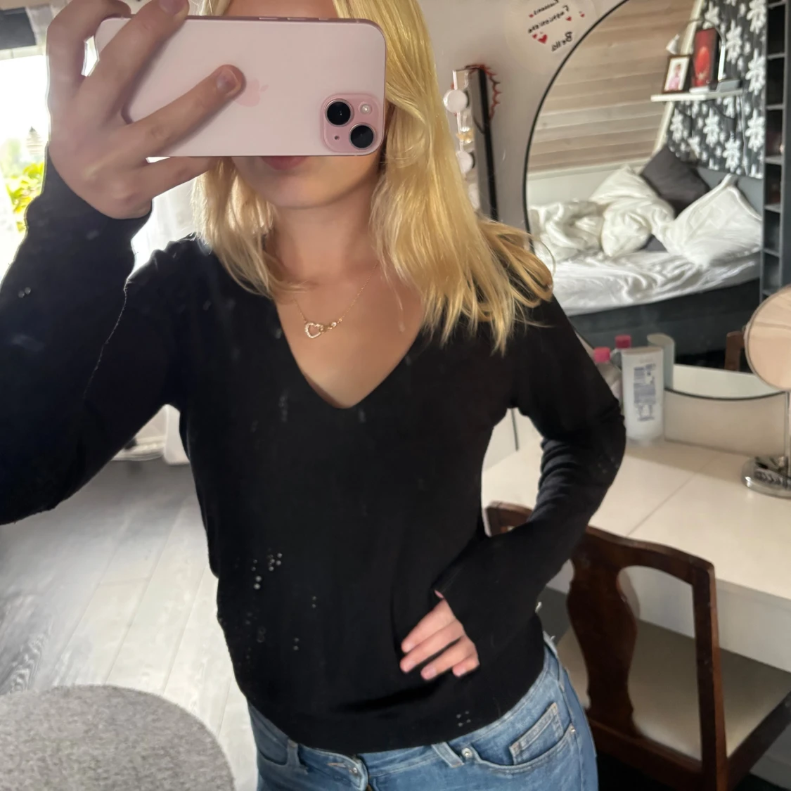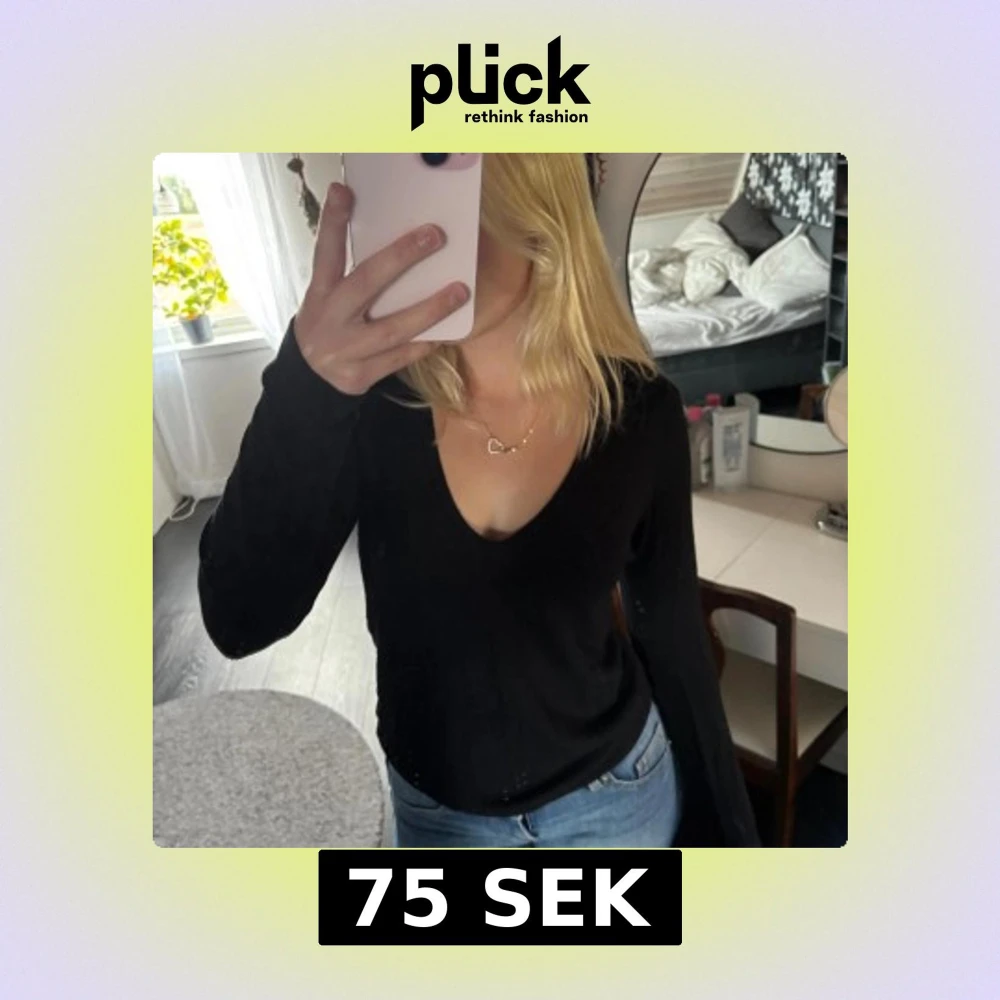 En svart långärmad tröja med djup v-ringning. Tröjan har en enkel och stilren design som passar perfekt till jeans. Mjuk och skön att bära, med normal passform och klassisk look.