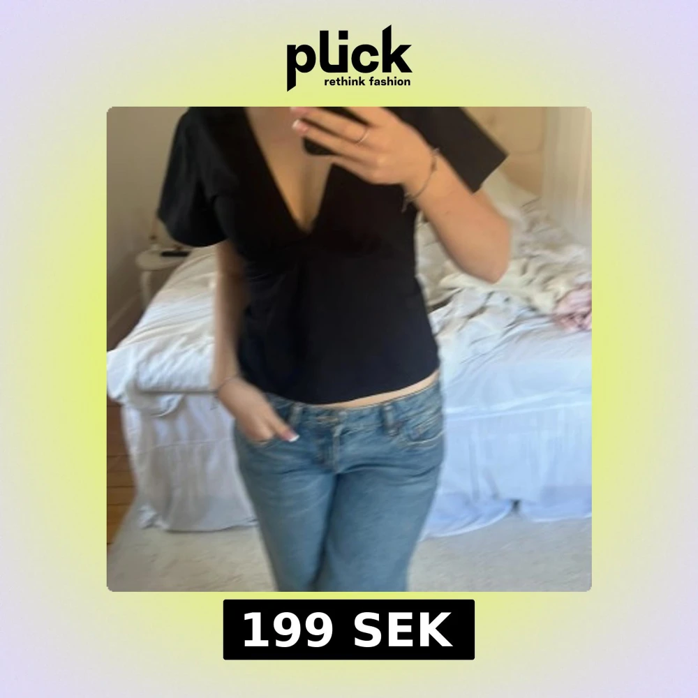 Snygg svart v-ringad topp med korta ärmar. Perfekt för en stilren look. Passar bra till både jeans och kjol. Ja har en nål vid tröjan som ja satt på just vid de tillfället så ni ej tror de en del av tröjan, rosett där bak!