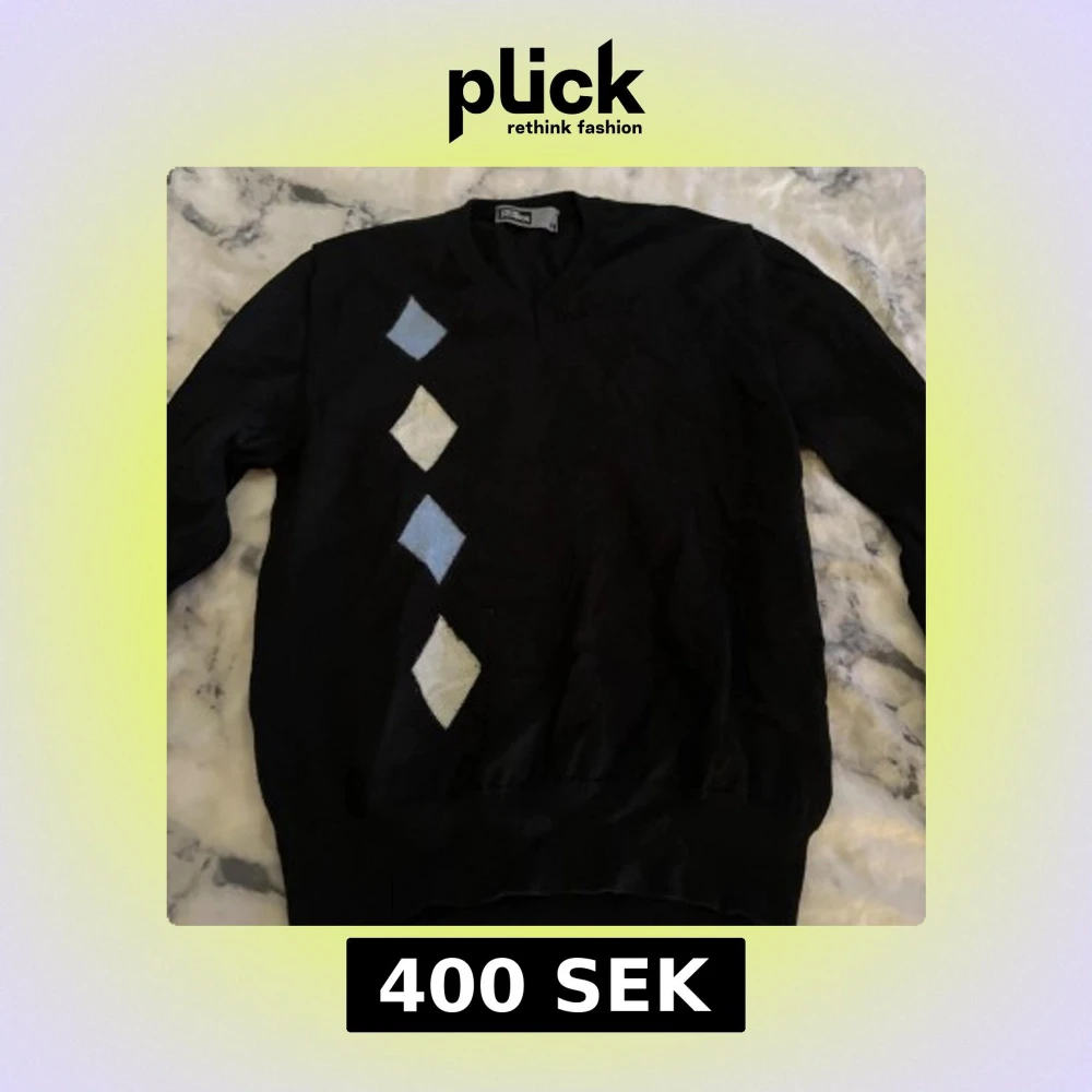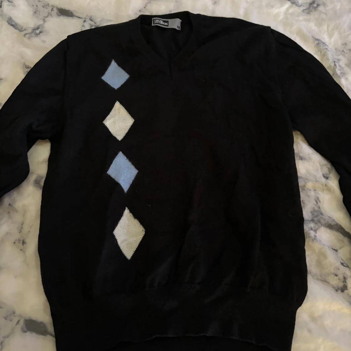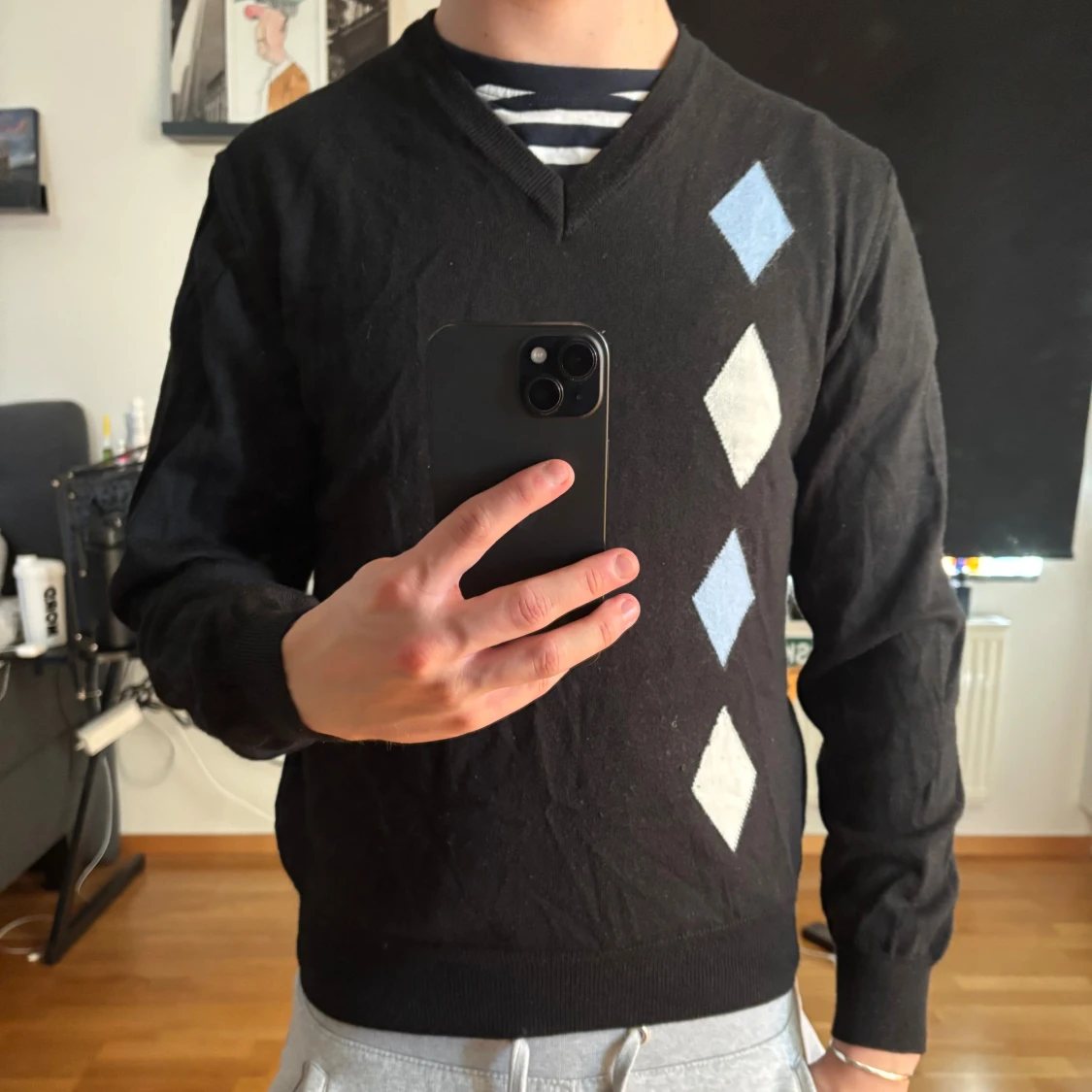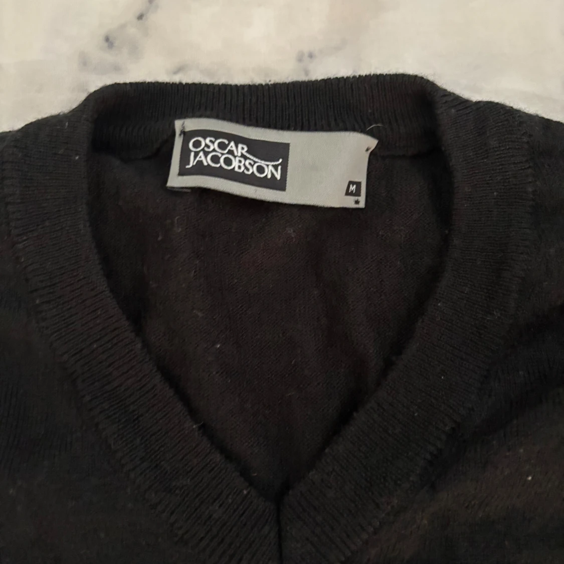 Svart v-ringad tröja från Oscar Jacobson med lång ärm och coolt rutmönster i vitt och ljusblått längs ena sidan. Tröjan är stickad och har ribbade muddar vid ärmslut och nederkant. Perfekt för dig som gillar klassisk stil med en twist.