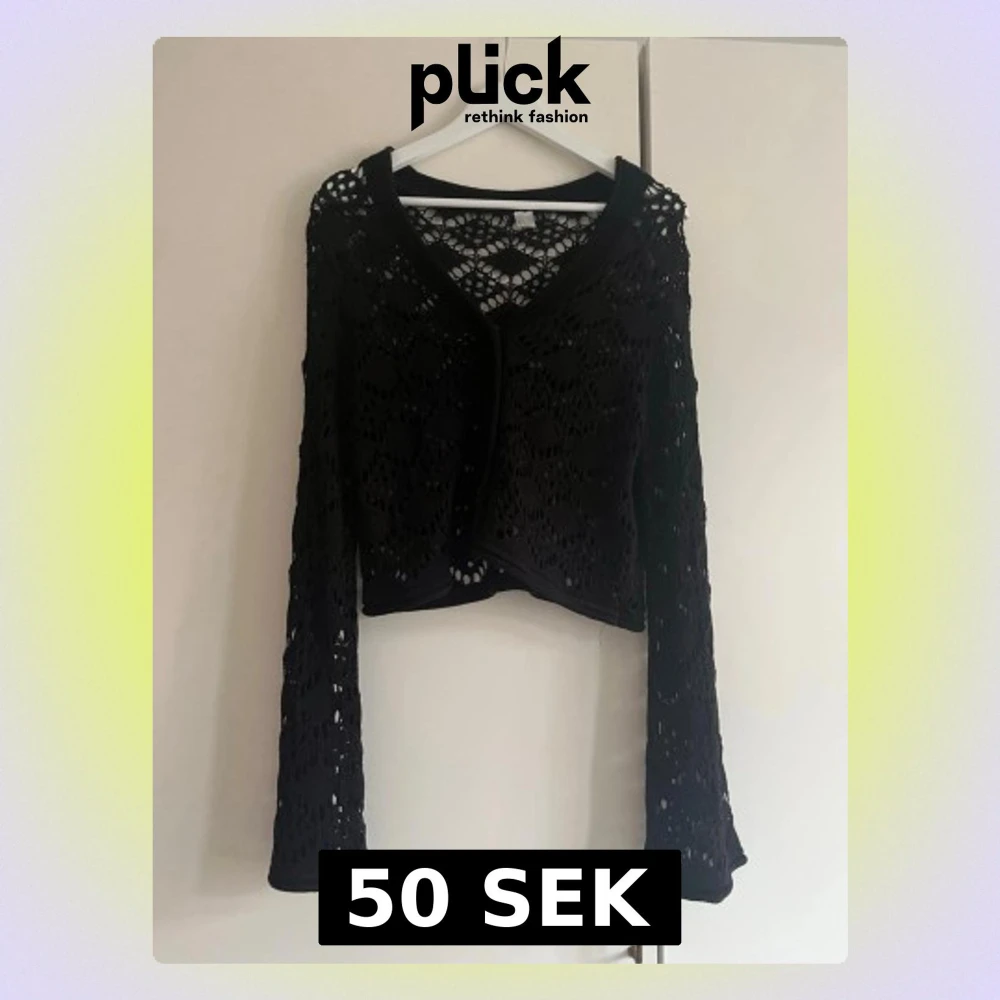 Säljer en svart, virkad kofta från H&M Divided i storlek S. Koftan har långärmade ärmar och ett snyggt genombrutet mönster som ger en cool och trendig vibe. Perfekt att slänga över en topp för en chill look. Croppad passform och mjukt stickat material.