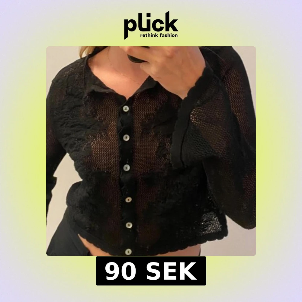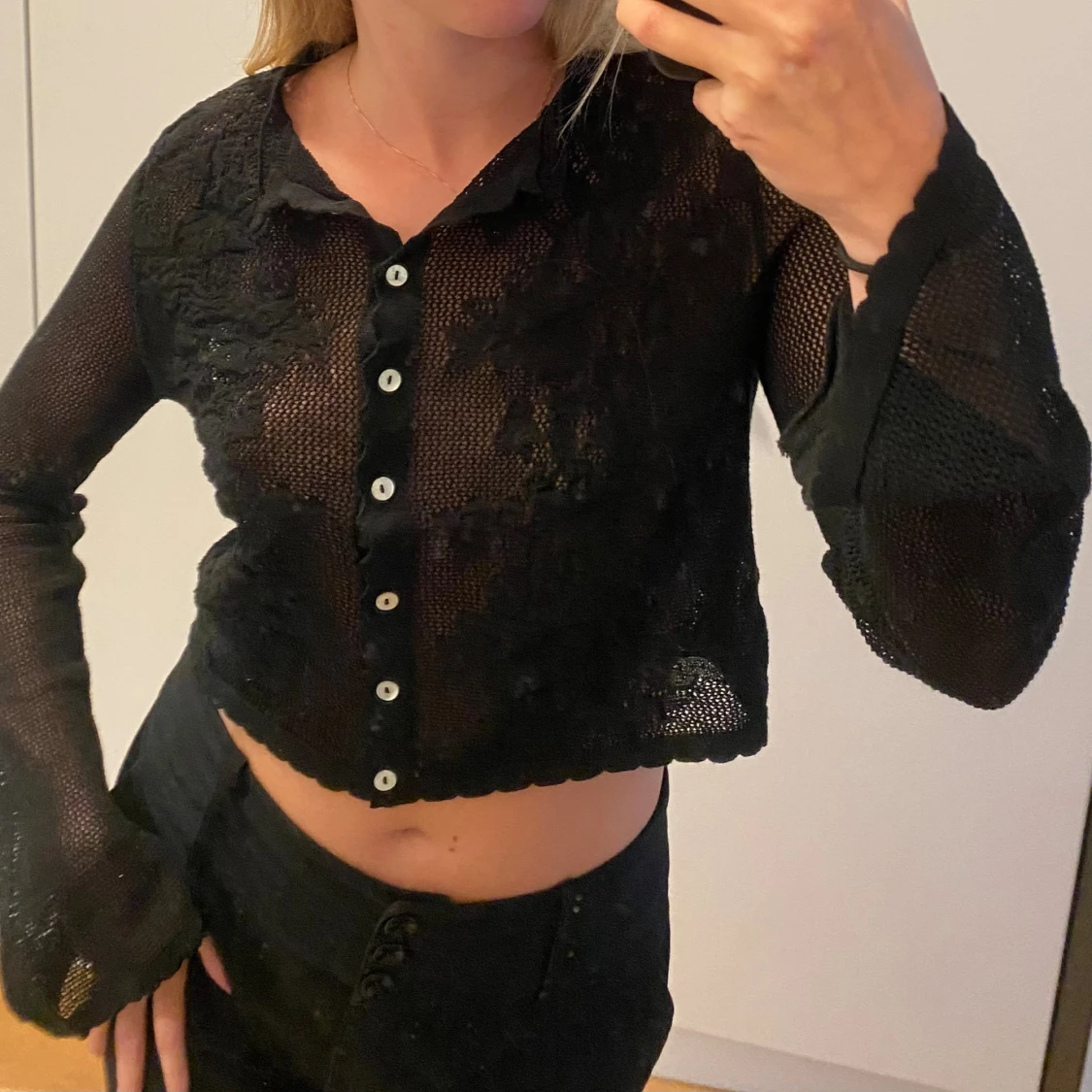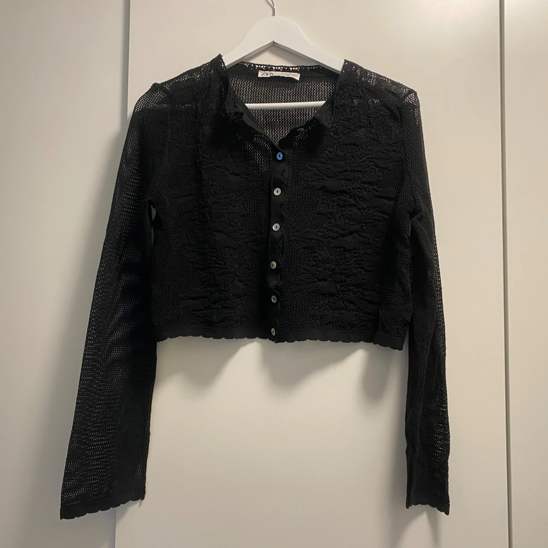 Svart virkad tröja från Zara med lång ärm, croppad passform och snygga knappar framtill. Skjortan har spetsdetaljer och vågig kant vid ärmslut och nederkant.🖤💘