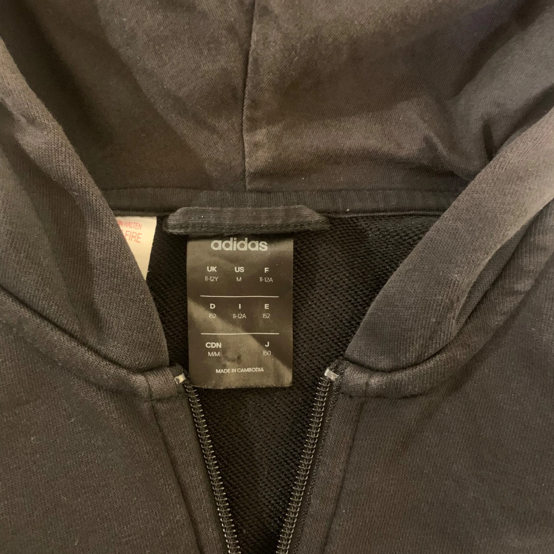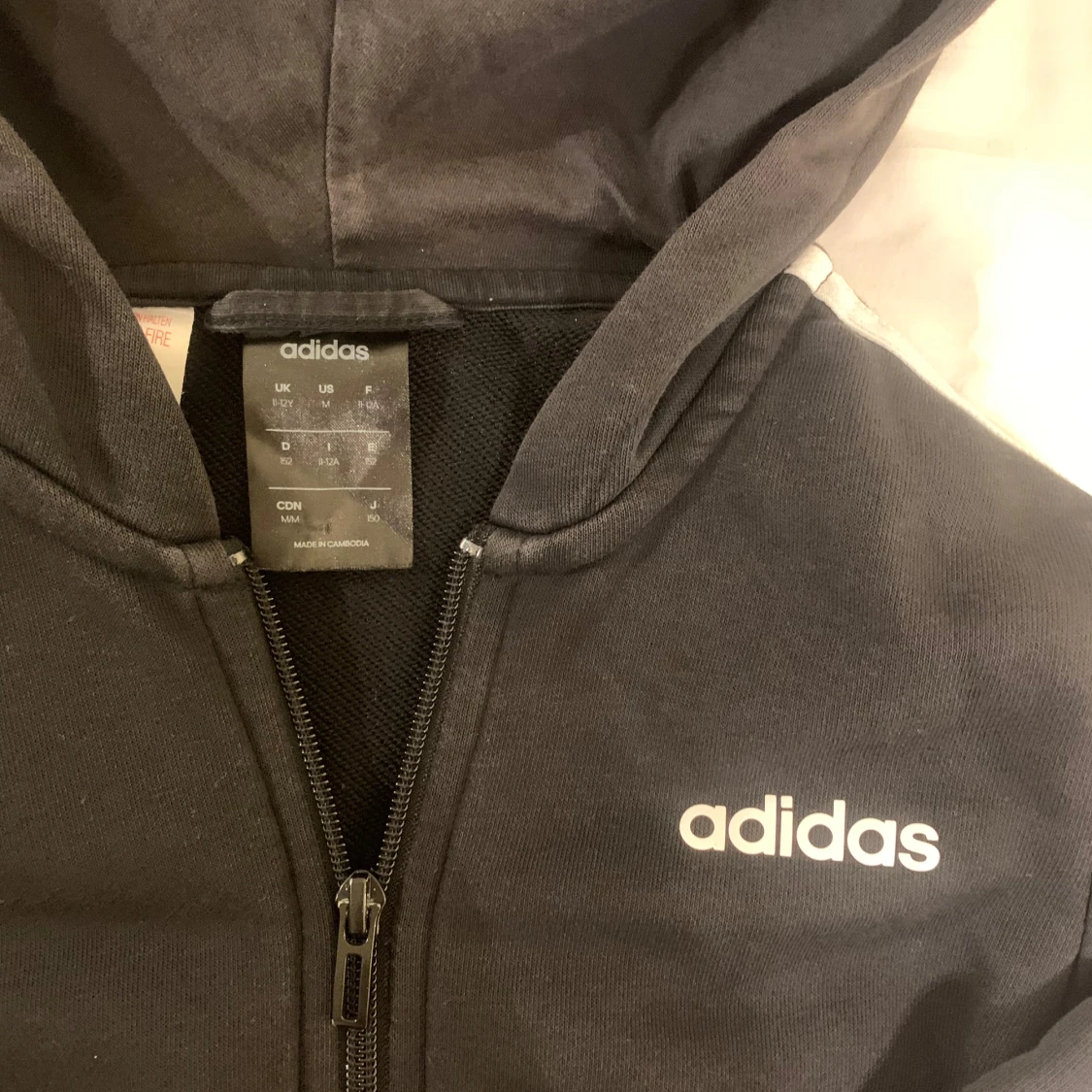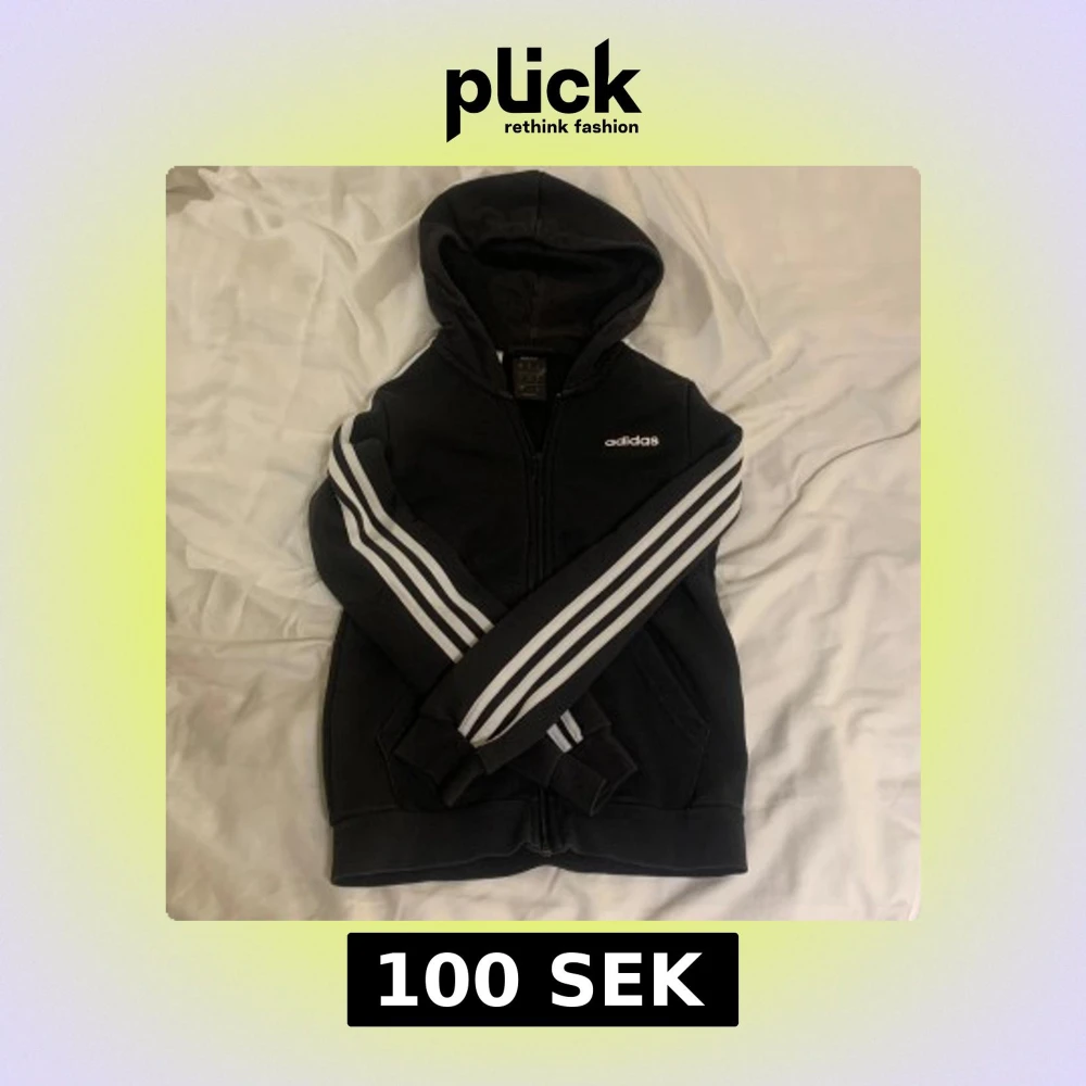 Säljer en svart huvtröja från Adidas med klassiska vita ränder längs ärmarna. Tröjan har dragkedja och en bekväm huva.