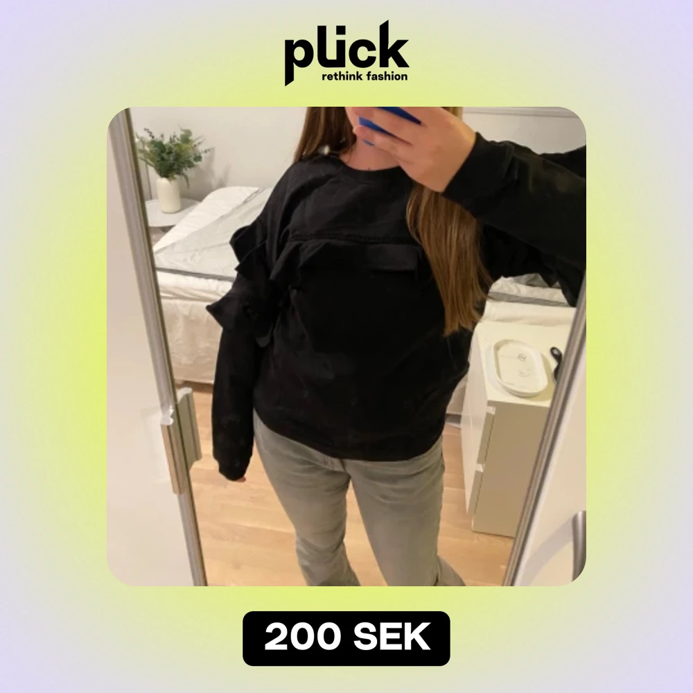 Säljer en svart lite tjockare tröja med volanger Storleken är 158/164 men passar som S/M Nästan aldrig använd