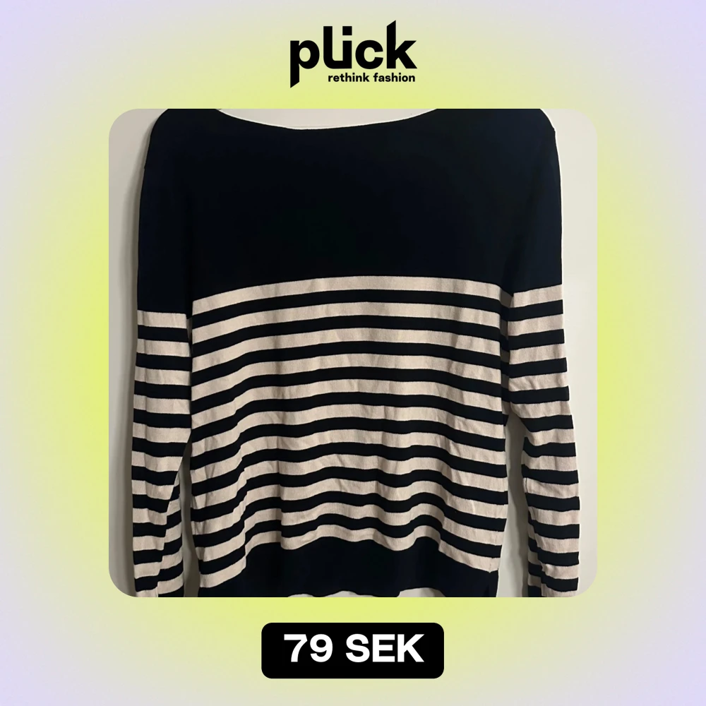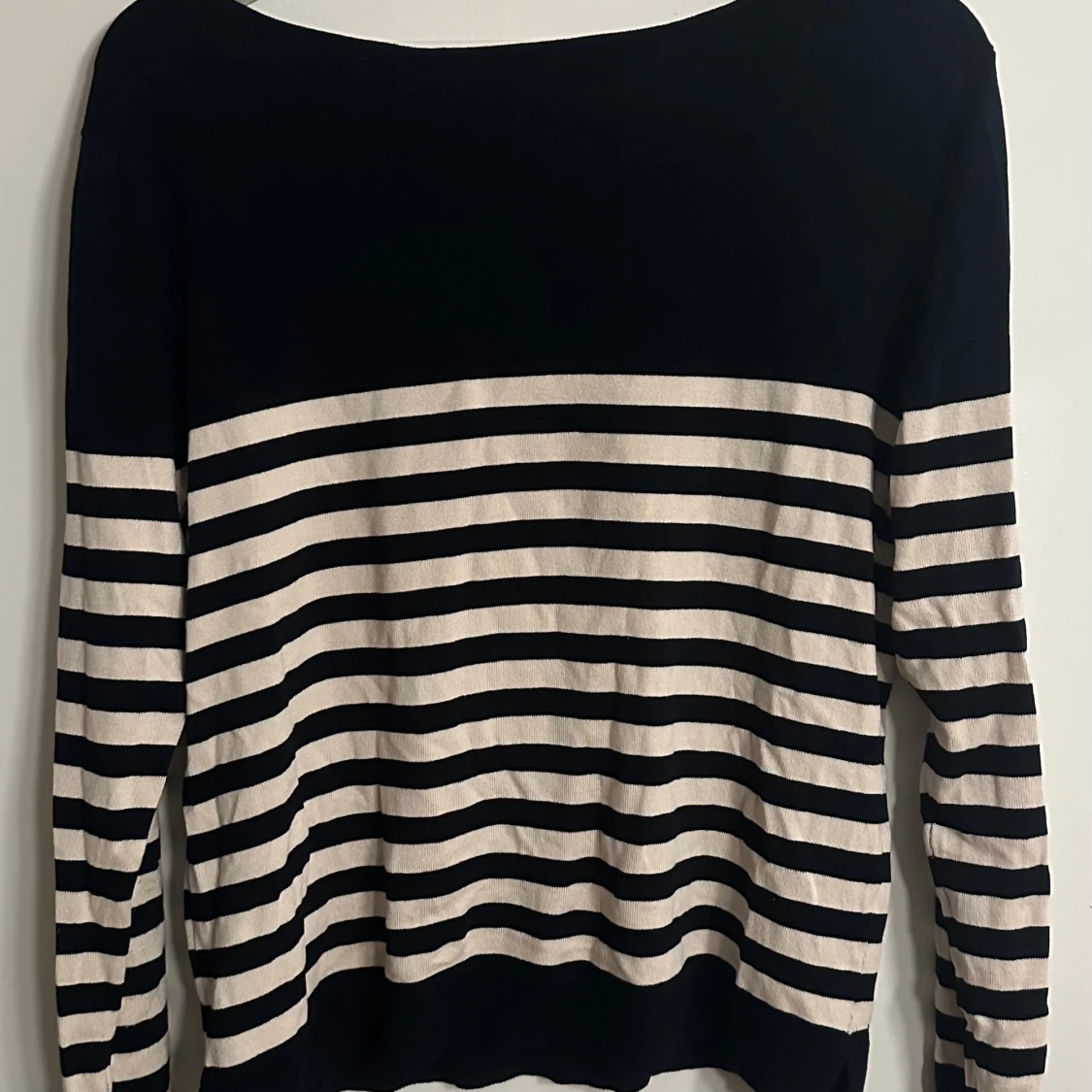 Superfin svart/blå finstickad tröja med beiga ränder. Använd fåtal gånger så den är i princip i nyskick💓 Tveka inte att höra av er om ni har några frågor!!
