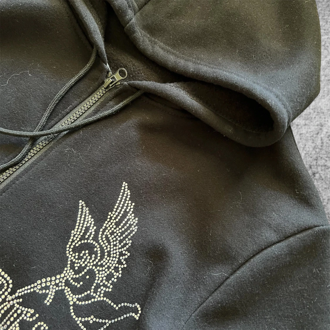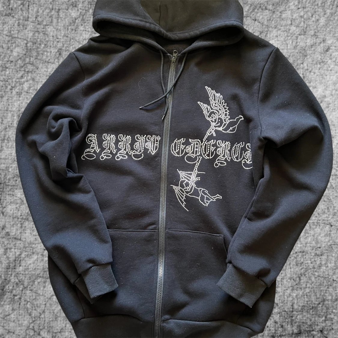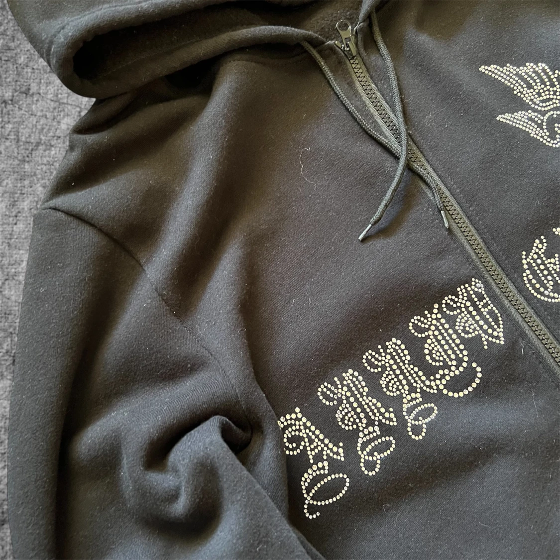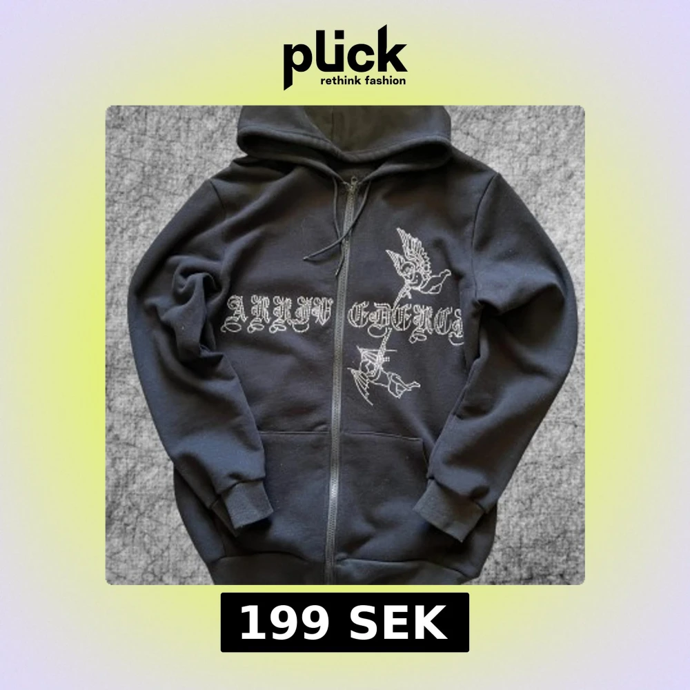 Svart zip hoodie i storlek S med strassdetaljer och tryck på framsidan. Tröjan har dragkedja, huva och fickor framtill. Storlek S men stor för storleken.