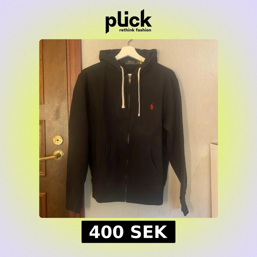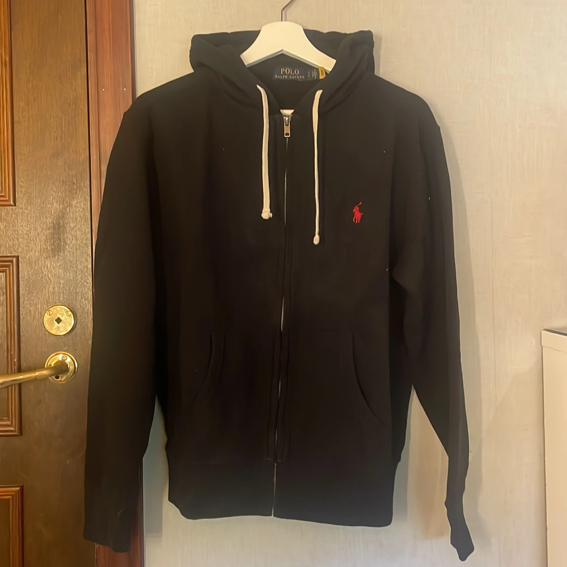 Svart Zip hoodie från Polo Ralph Lauren med vit snörning i huvan och röd broderad logga på bröstet. Dragkedja framtill, två fickor och mjukt material som känns skönt mot huden.