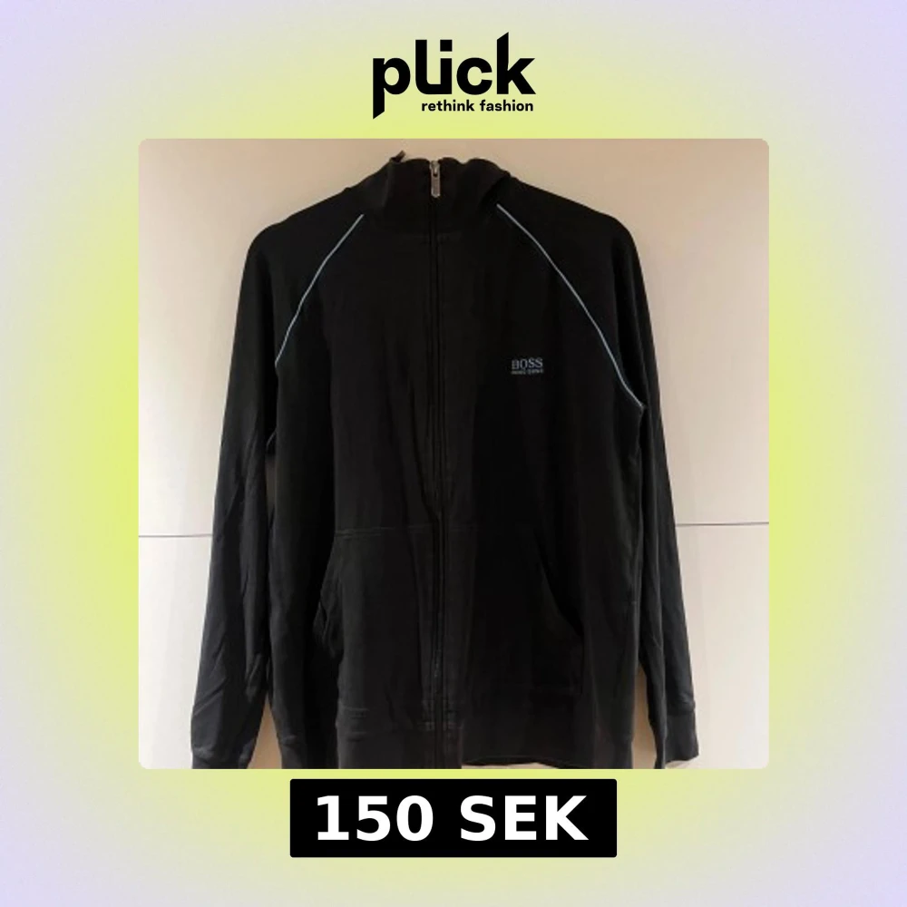 Svart zipjacka från Hugo Boss med diskret logga på bröstet och ljusblå detaljer längs axlarna. Jackan har huva, hel dragkedja och två fickor framtill. Perfekt för en chill och stilren look.