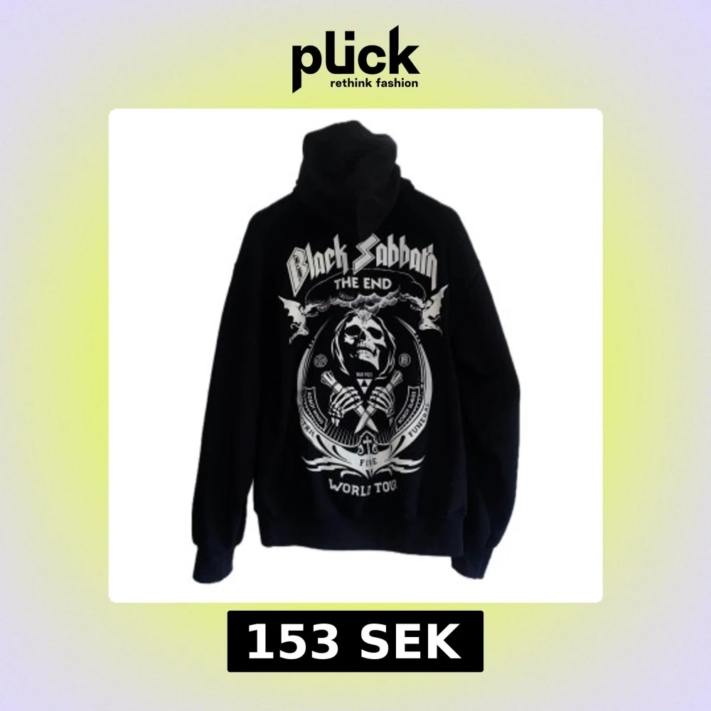 Svart hoodie med stor vit Black Sabbath 'The End World Tour'-print både fram och bak. Tröjan har huva med snörning och långa ärmar. Grymt tryck med dödskalle och coola detaljer, perfekt för dig som älskar rock och vill sticka ut.
