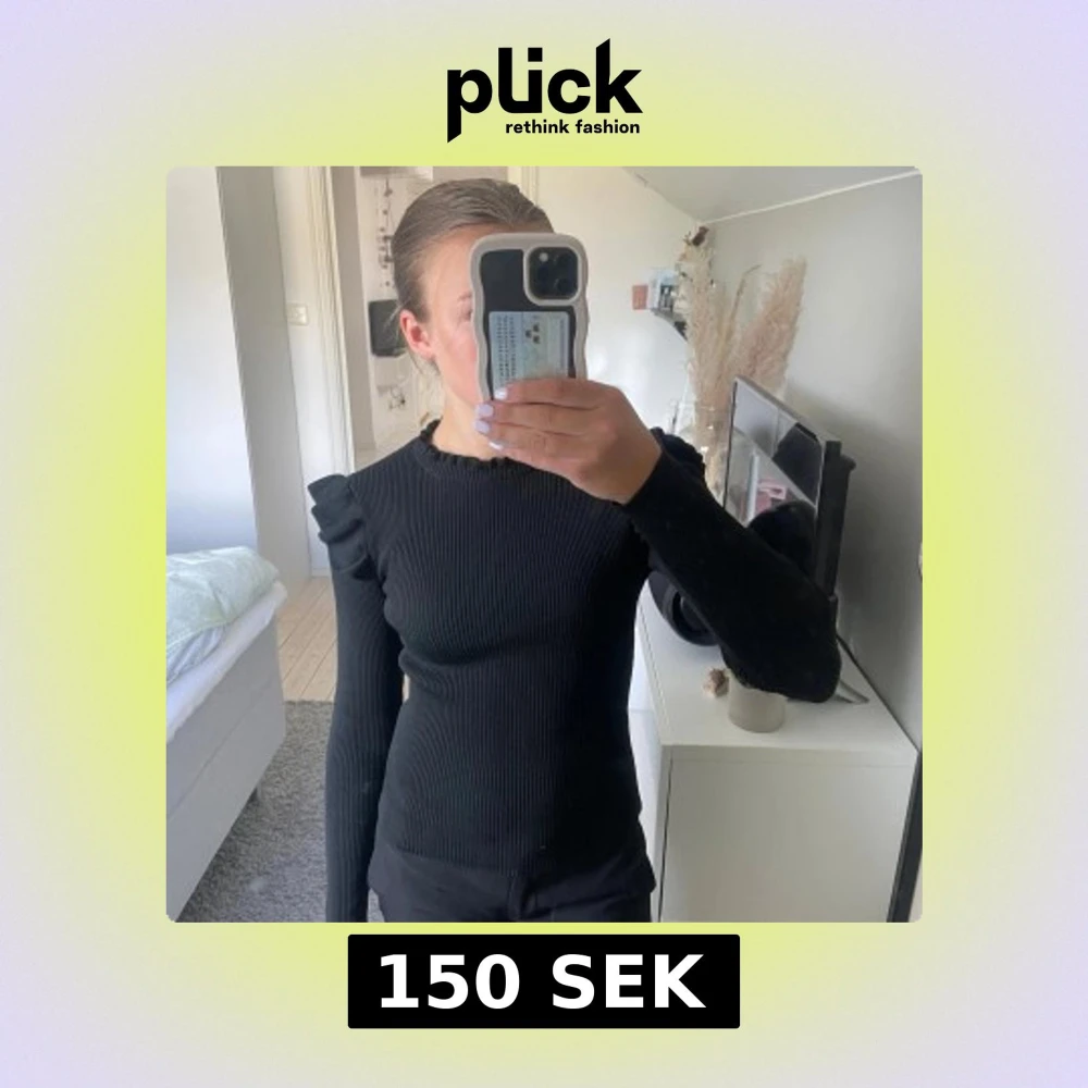 Säljer en svart ribbad tröja med lång ärm och volangdetaljer på axlarna. Tröjan har en tight passform. Har även som en liten minivolang i halsen. Ser ut som ny då den är använd några få gånger.
