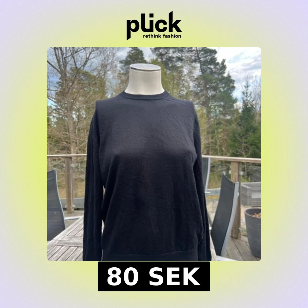 En enkel svart tröja från Uniqlo i storlek M. Tröjan har rund halsringning och långa ärmar, perfekt för lager-på-lager eller som basplagg. Mjuk och bekväm, passar till det mesta i garderoben.