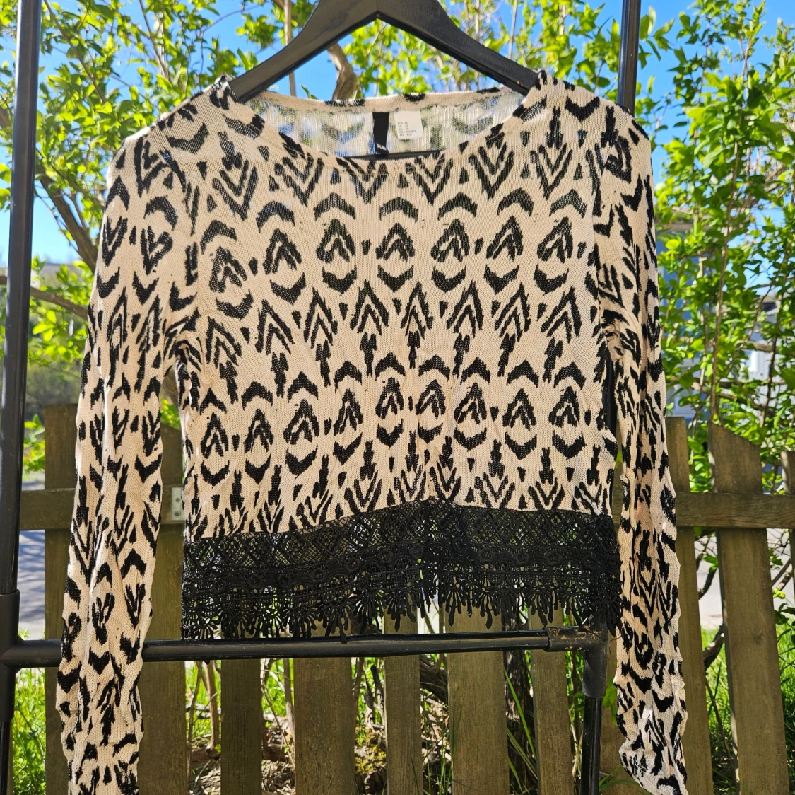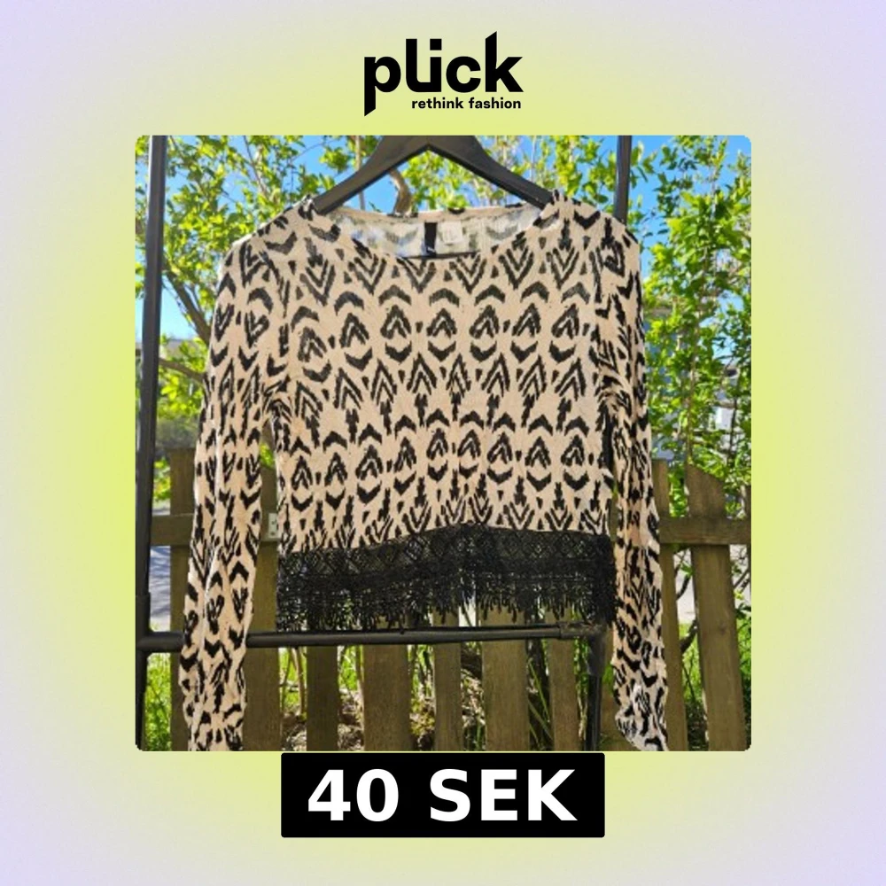 Säljer en croppad långärmad tröja i svartvitt mönster med snygga fransdetaljer nertill. Tröjan har rund halsringning och är perfekt för dig som vill sticka ut lite extra.