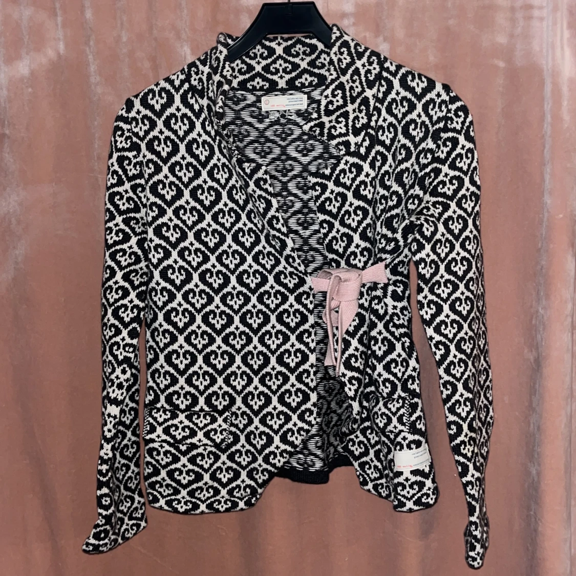 Säljer en svartvit omlottkofta från Odd Molly med grafiskt mönster och en ljusrosa rosett i midjan. Koftan har långa ärmar och är perfekt för dig som vill ha något både snyggt och bekvämt. Är i storlek 1 så motsvarar en S