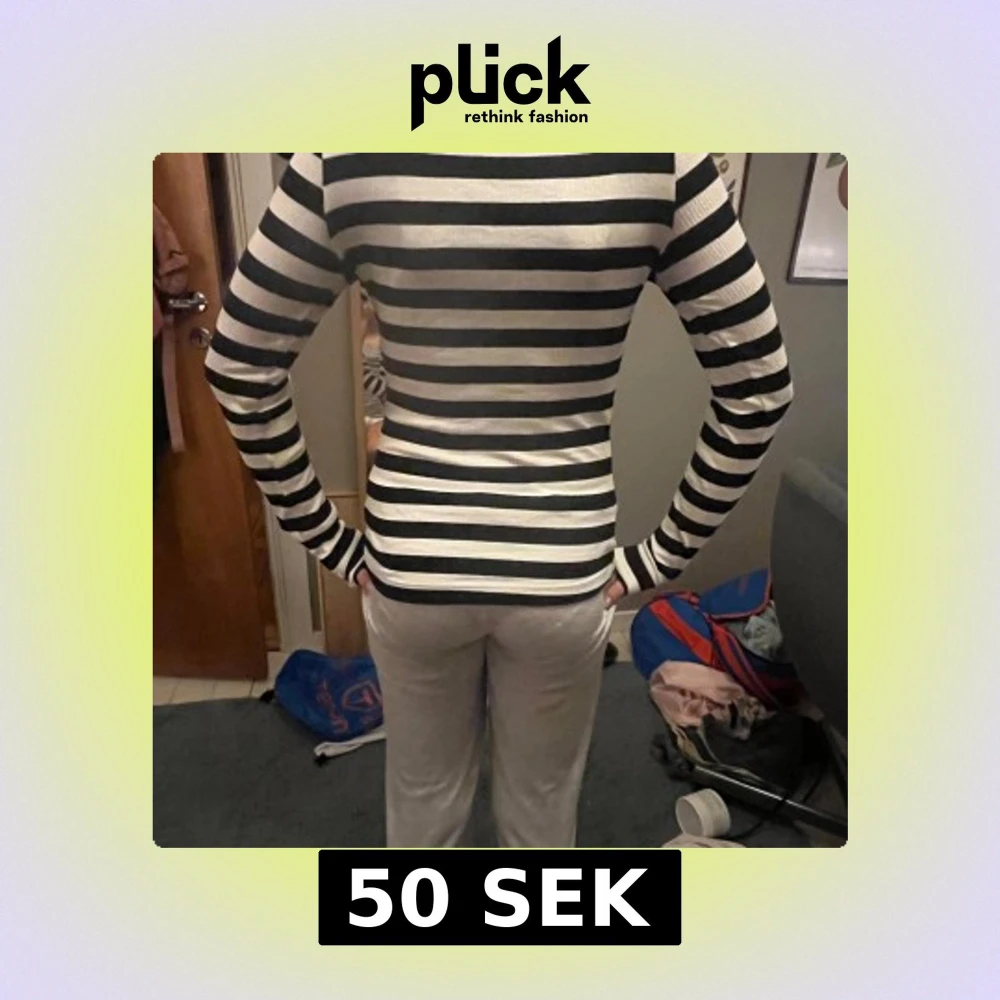 Säljer en svartvit långärmad tröja från H&M i storlek XS. Tröjan har ett klassiskt horisontellt randigt mönster och är ribbad i materialet, vilket gör den både skön och snygg. Passformen är tight och den har en rund hals. Perfekt för dig som gillar stilrena basplagg☺️