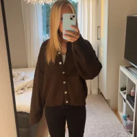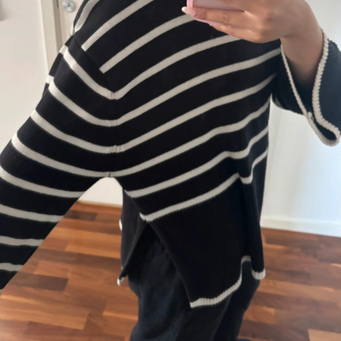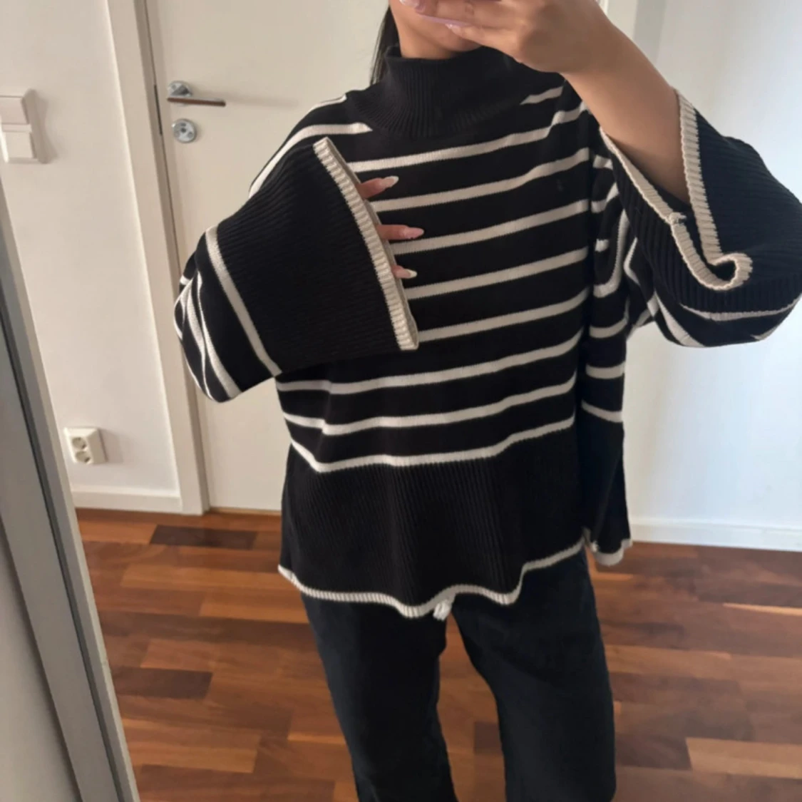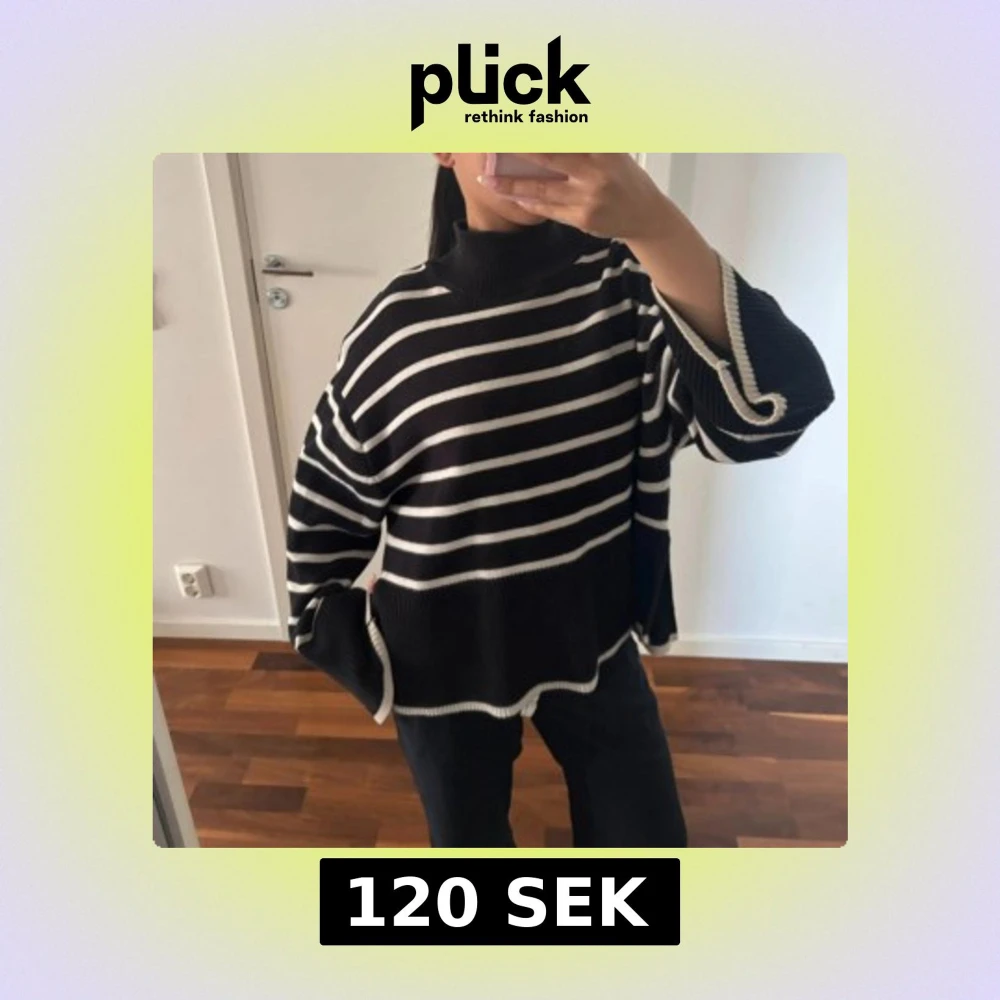 Oversized svart stickad polotröja med vita horisontella ränder. Tröjan har vida, långa ärmar och hög krage. Avslut och ärmslut har vit kant. Perfekt för dig som gillar en chill och trendig look.