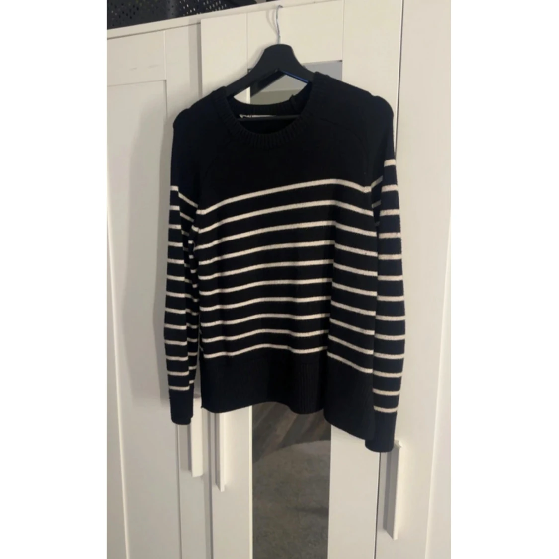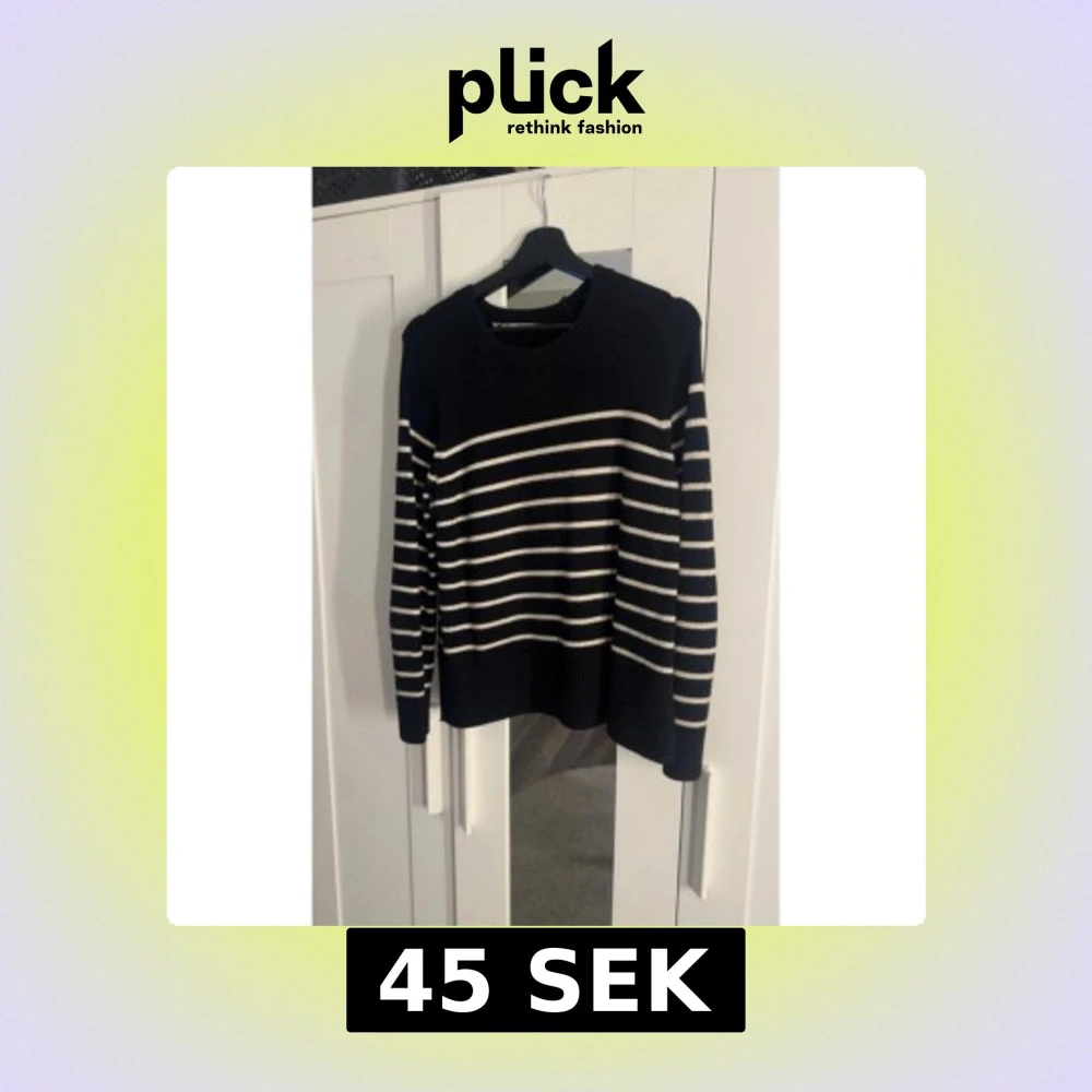 Snygg svart stickad tröja med vita horisontella ränder. Tröjan har rund halsringning och långa ärmar, perfekt för lager-på-lager under kyligare dagar. Klassisk och stilren design som funkar till det mesta.