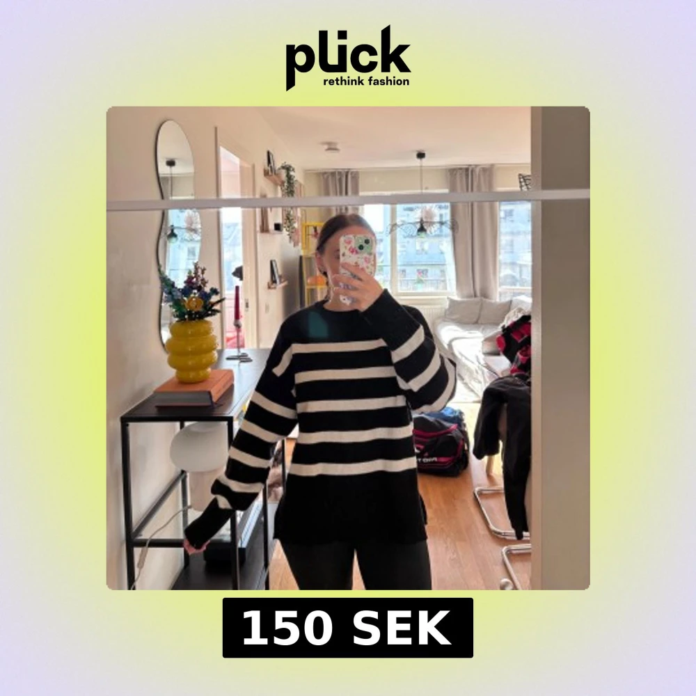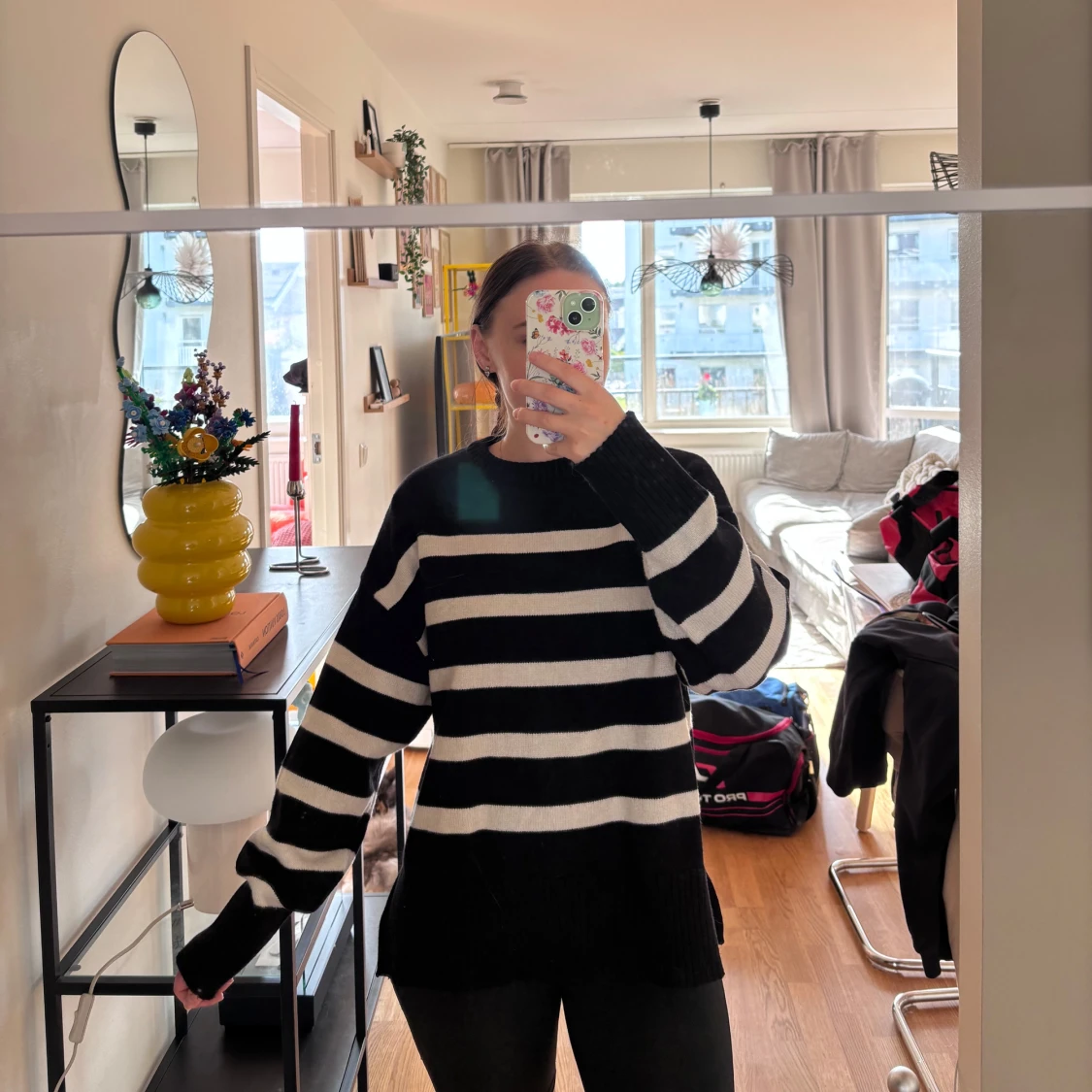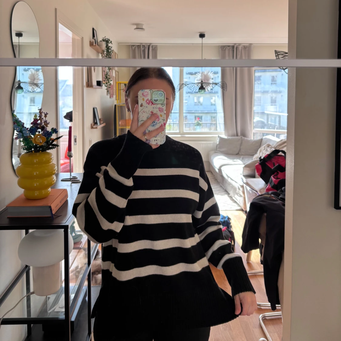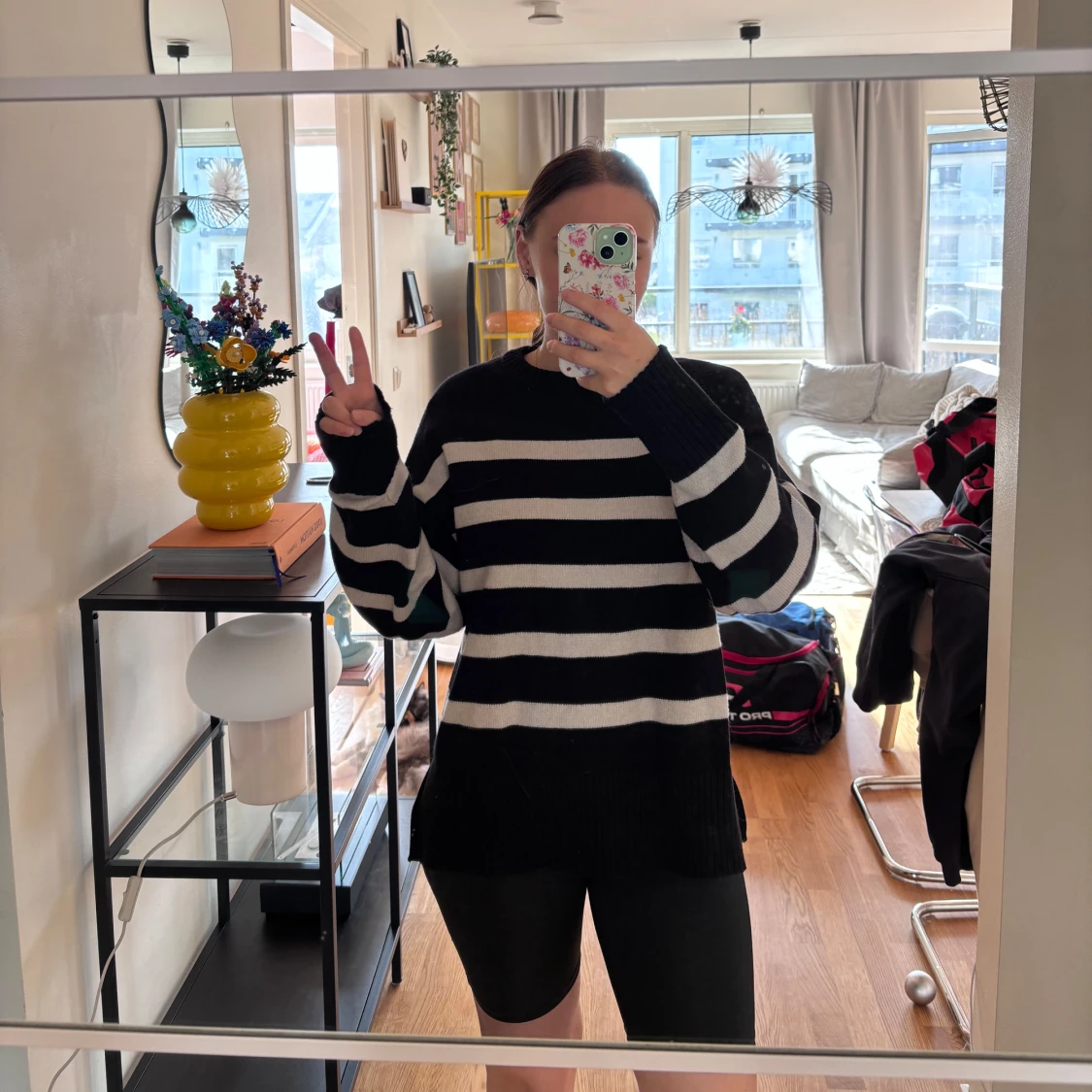 Säljer en oversized stickad tröja med breda svarta och vita ränder. Tröjan har lång ärm, rund halsringning och en loose fit som ger en chill vibe. Perfekt för lager-på-lager och funkar året runt när du vill vara både bekväm och snygg.